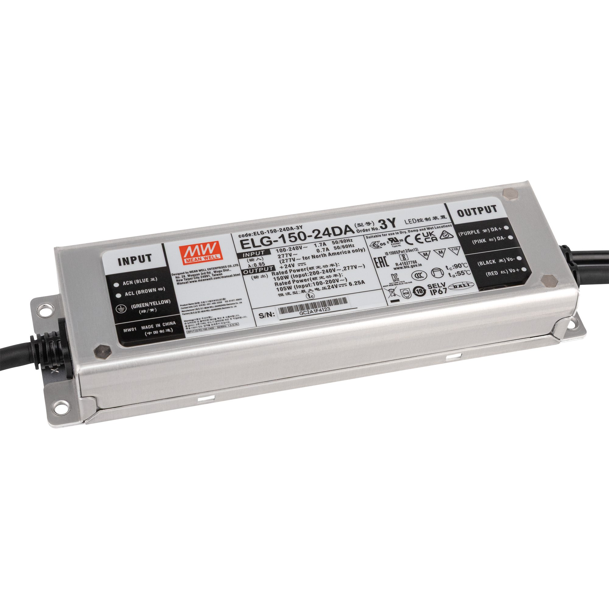 Die Serie ELG-150 ist ein 150W AC/DC-LED-Treiber mit dem Dual-Mode-Konstantspannungs- und Konstantstromausgang. ELG-150 wird von 100?305 V AC betrieben und bietet Modelle mit 24V an. Dank des hohen Wirkungsgrades von bis zu 91%, mit dem lüfterlosen Design, kann die gesamte Serie bei -40? ~ +90? Gehäusetemperatur unter freier Luftkonvektion betrieben werden. Das Design des Metallgehäuses und die Schutzart IP67 erlauben es dieser Serie, sowohl für Innen- als auch für Außenanwendungen geeignet zu sein. ELG-150 ist mit verschiedenen Funktionsoptionen, wie z.B. Dimm-Methoden, ausgestattet, um die optimale Designflexibilität für LED-Beleuchtungssysteme zu gewährleisten.