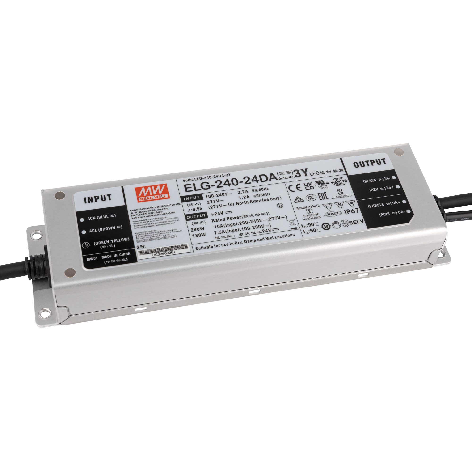 Die Serie ELG-240 ist ein 240 W AC/DC-LED-Treiber mit dem Dual-Mode-Konstantspannungs- und Konstantstromausgang. ELG-240 wird von 100?305 V AC mit 24V betrieben. Dank des hohen Wirkungsgrads von bis zu 93% und des lüfterlosen Designs kann die gesamte Serie bei -40? ~ +90? Gehäusetemperatur unter freier Luftkonvektion betrieben werden. Das Design des Metallgehäuses und die Schutzart IP67 erlauben es dieser Serie, sowohl für Innen- als auch für Außenanwendungen geeignet zu sein. ELG-240 ist mit verschiedenen Funktionsoptionen ausgestattet, wie z.B. Dimmverfahren, um die optimale Designflexibilität für LED-Beleuchtungssysteme zu gewährleisten.