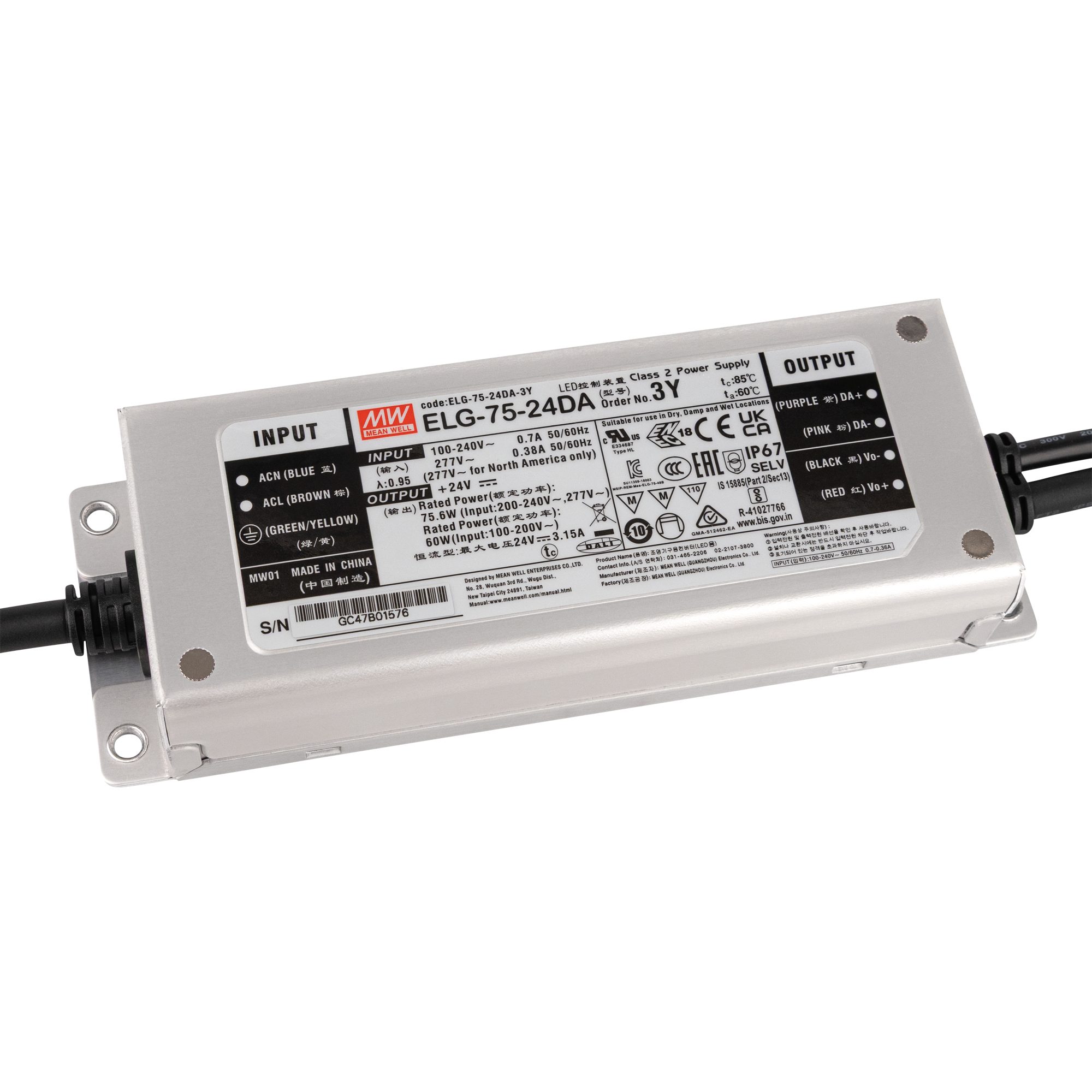 Bei der Serie ELG-75 handelt es sich um einen 75W AC/DC-LED-Treiber mit dem Dual-Mode-Konstantspannungs- und Konstantstromausgang. ELG-75 wird von 100?305 V AC bei 24V betrieben. Dank des hohen Wirkungsgrades von bis zu 90%, mit dem lüfterlosen Design, kann die gesamte Serie bei -40? ~ +85? Gehäusetemperatur unter freier Luftkonvektion betrieben werden. Das Design des Metallgehäuses und die Schutzart IP67/IP65 erlauben es dieser Serie, sowohl für Innen- als auch für Außenanwendungen geeignet zu sein. ELG-75 ist mit verschiedenen Funktionsoptionen, wie z.B. Dimm-Methoden, ausgestattet, um die optimale Designflexibilität für LED-Beleuchtungssysteme zu gewährleisten.