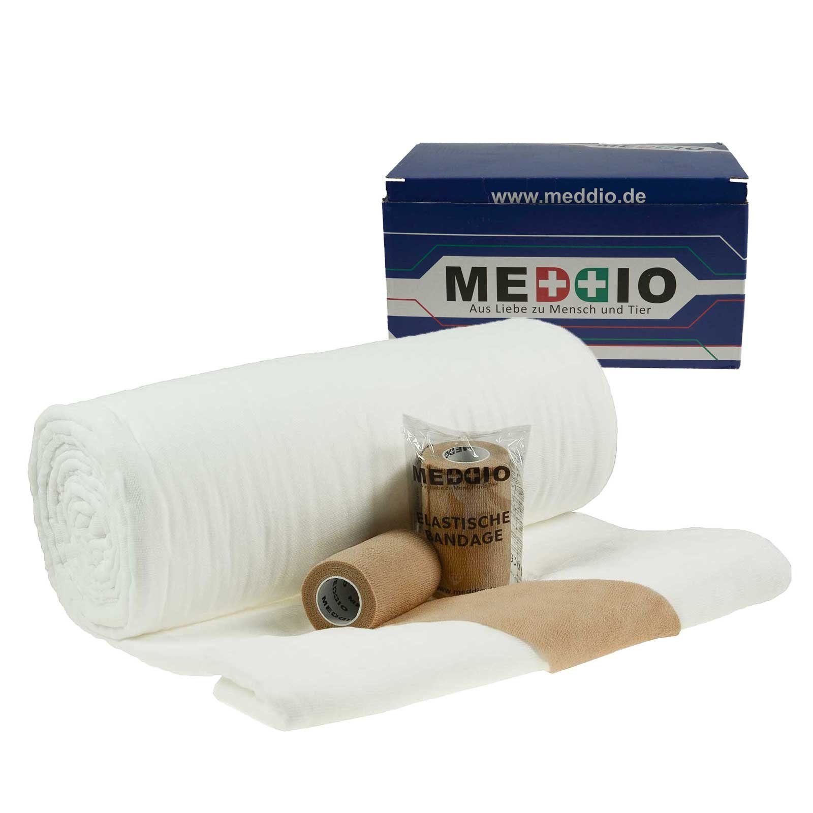 Dieses Erste-Hilfe-Paket sollte in keiner Stallapotheke fehlen. Die Produkte finden vorwiegend in der Veterinärmedizin bei Pferden und in der Rinderhaltung Anwendung. Die Verbände können mit der Verbandwatte gepolstert und wenn nötig mit Flüssigkeit getränkt werden. Die Haftbandagen fixieren die Verbandwatte schnell und verkleben nicht mit Haut oder Fell. Die Bandagen können Rückstandsfrei wieder gelöst werden. Praktisch ist dieses Paket auch für vorbeugende Maßnahme und zur Minderung des Verletzungsrisikos im Training und beim Transport.