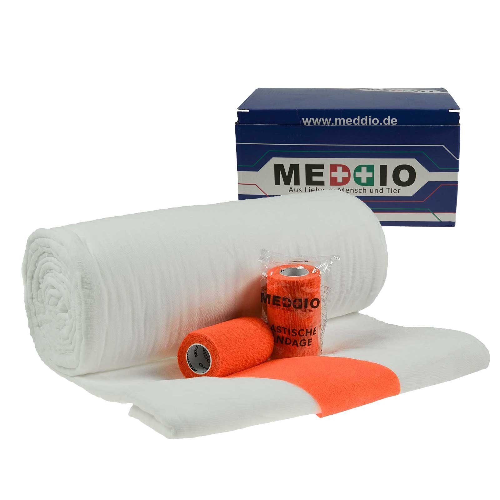 Dieses Erste-Hilfe-Paket sollte in keiner Stallapotheke fehlen. Die Produkte finden vorwiegend in der Veterinärmedizin bei Pferden und in der Rinderhaltung Anwendung. Die Verbände können mit der Verbandwatte gepolstert und wenn nötig mit Flüssigkeit getränkt werden. Die Haftbandagen fixieren die Verbandwatte schnell und verkleben nicht mit Haut oder Fell. Die Bandagen können Rückstandsfrei wieder gelöst werden. Praktisch ist dieses Paket auch für vorbeugende Maßnahme und zur Minderung des Verletzungsrisikos im Training und beim Transport.