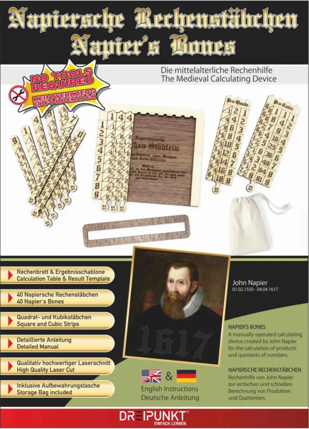 1617 hat John Napier so genannte Rechenstäbchen entwickelt, die komplexe Multiplikations- und Divisionsaufgaben auf einfache Additionen zurückführen. Im 17. Jahrhundert konnten zwar viele Menschen bereits einfache Additionsaufgaben lösen, das Multiplizieren und Dividieren war für viele Personen jedoch zu kompliziert. Die Napierschen Rechenstäbchen versetzten auch mathematisch unerfahrene Menschen in die Lage, komplexe Multiplikationen durchzuführen. Erlebe die Faszination dieses antiken Rechenhilfsmittels und löse komplexe Aufgaben auf verblüffend einfache Weise! Inhalt - 40 Rechenstäbchen - 1 Quadratstäbchen - 1 Kubikstäbchen - 1 Rechenbrett (fertig zusammengebaut) - Ausführliche Anleitung (in deutscher und englischer Sprache) - attraktive Verpackung - Aufbewahrungsbeutel aus Stoff Все Bauteile sind lasergenau geschnitten aus hochwertigem Ahorn- und Walnussholz und für eine perfekte Erkennbarkeit mit einer Hochkontrast-Lasergravur in 500dpi versehen.