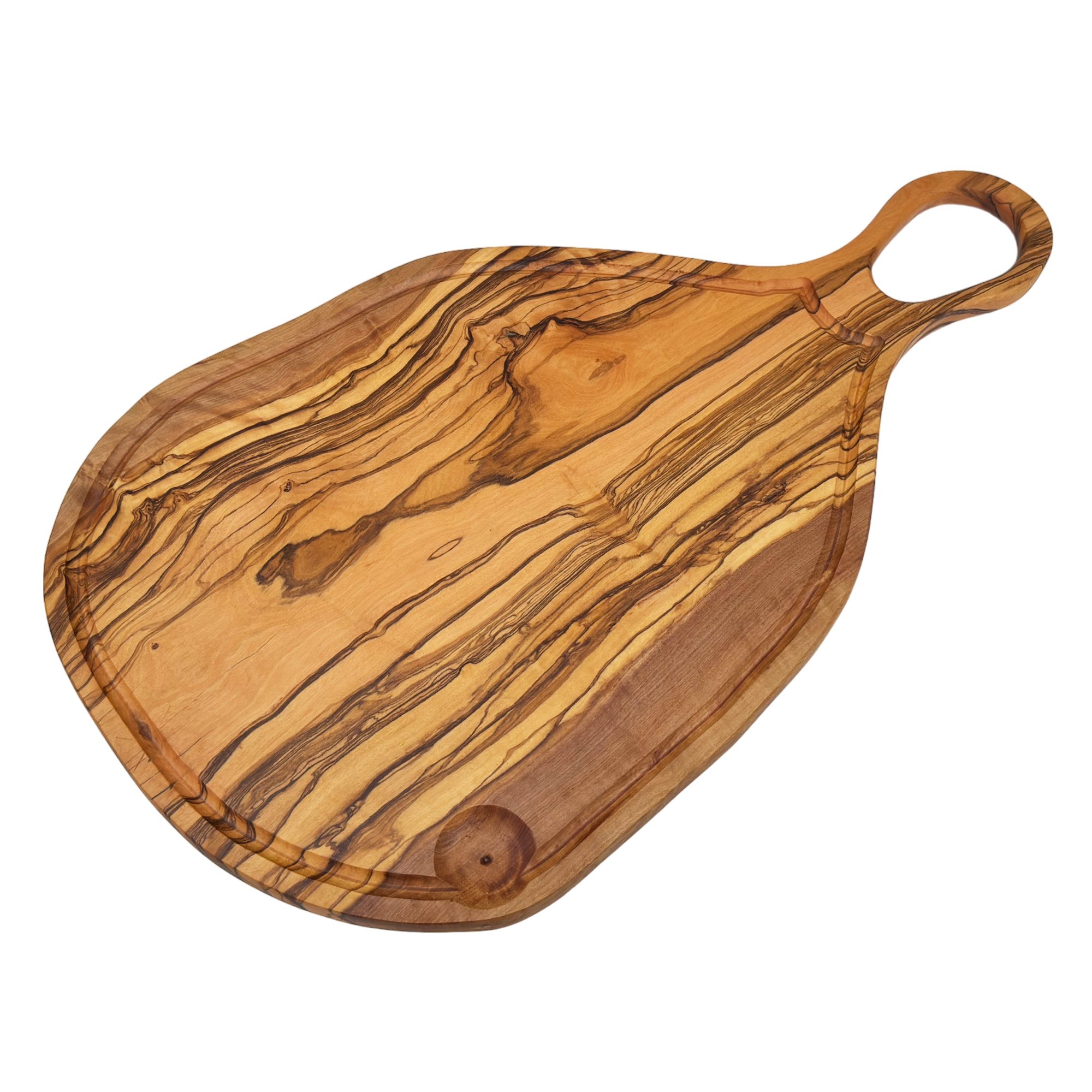 Das Servierbrett "The Buffet" ist aus hochwertigem Olivenholz gefertigt und in sorgfältiger Handarbeit hergestellt, wodurch jedes Stück ein Unikat ist. Die charakteristische rötlich-braune Maserung und der unregelmäßige Faserverlauf verleihen dem Brett eine außergewöhnliche Optik. Dieses vielseitige Brett eignet sich nicht nur als Servierbrett, sondern auch hervorragend als Steakbrett, Grillbrett, Buffetbrett oder Tranchierbrett. Die praktische Saftrille erleichtert das Abfließen von Flüssigkeiten und sorgt für eine saubere Nutzung. Lieferumfang: 1 Servierbrett mit Saftrille (unregelmäßig geformt) 100% Naturprodukt: Hergestellt aus naturbelassenem Olivenholz und in feiner Handarbeit gefertigt. Maße (ca.-Angaben): • Длина: wählbar in 50 cm, 55 cm, 60 cm • Breite: variiert aufgrund des Naturschnitts • Dicke: 1,5 bis 2,5 cm Pflegehinweise: • Reinigen Sie Ihr Unikat nach jedem Gebrauch per Hand. • Wischen Sie die Holzoberfläche idealerweise mit Wasser und ggf. ein wenig Spülmittel ab. • Trocknen Sie das Olivenholz gut ab, um Feuchtigkeitsaufnahme zu vermeiden. • Reiben Sie das Olivenholz in regelmäßigen Abständen mit ein wenig Speiseöl ein, um die schöne Farbe und einzigartige Maserung lange zu erhalten. • Nicht spülmaschinengeeignet. Da es sich um keine Massenproduktion handelt, unterscheiden sich die Produkte durch das ungleichmäßig wachsende Olivenholz nicht nur in Form und Maßen, sondern auch in der Maserung und Farbe. Dies macht jedes Produkt zu einem einzigartigen Unikat (Abweichungen vom Artikelbild sind möglich).