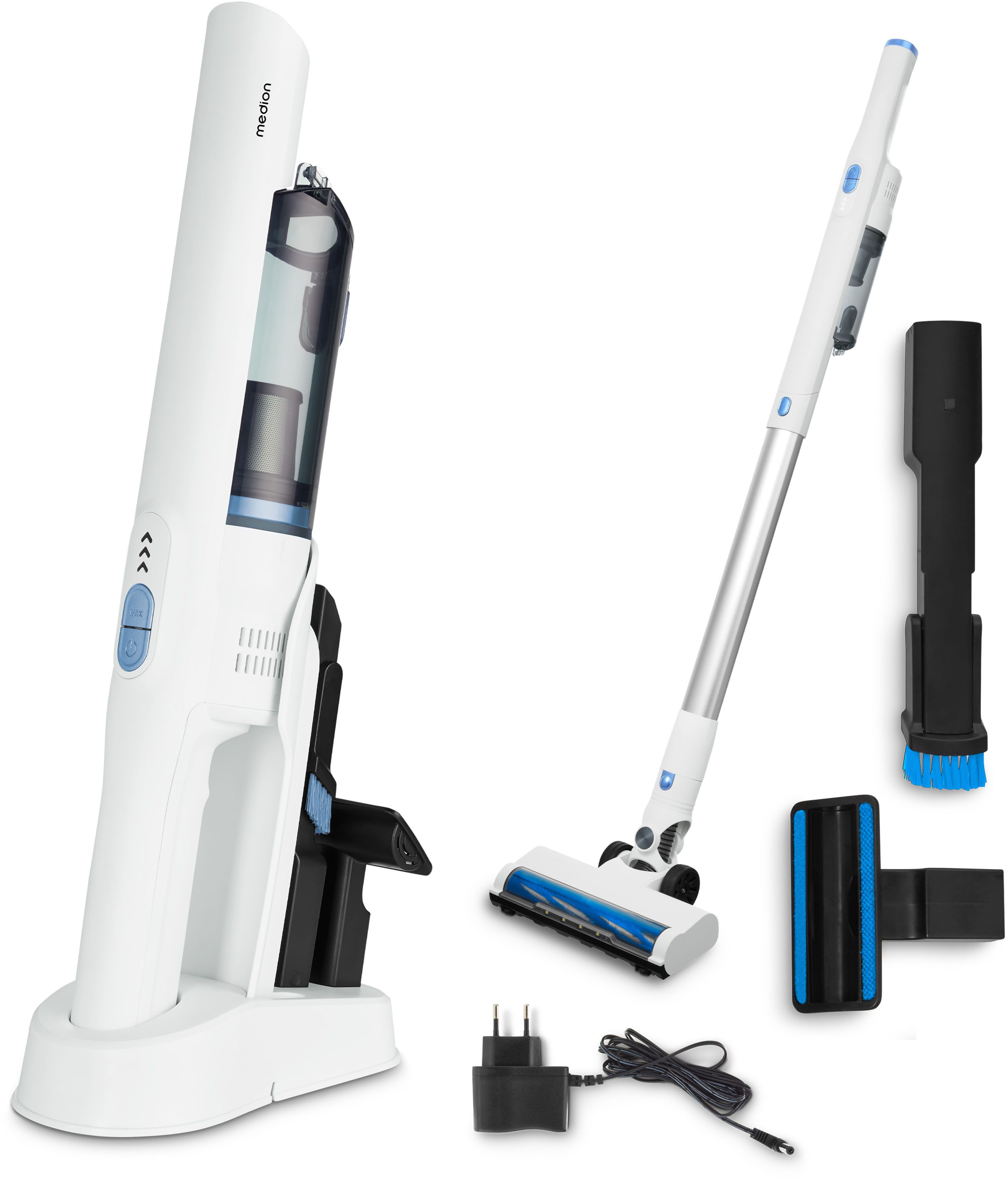 Mitgeliefertes Zubehör | Bodendüse mit Bürstenrolle, Polsterdüse, Fugendüse mit Klappbürste, Netzadapter, Wandhalterung, Aufbewahrungsstation |