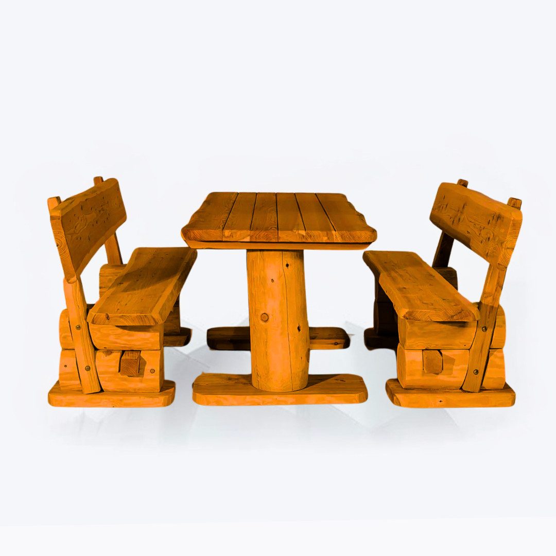 Unsere rustikale Gartengarnitur ist funktionell, massiv und ein absoluter Hingucker für Ihren Garten. Unsere Gartengarnitur „Rustikal“ ist aus massiver, heimischer Kiefer gefertigt. Die Garnitur steht aufgrund des hohen Gewichtes äußerst stabil. Die Sitzgarnitur hat aufgrund der Stärke des Holzes bereits eine hohe Lebenserwartung. Wenn man die Gartengarnitur im Winter ein wenig vor Witterungseinflüssen schützt und alle 2 Jahre mit einer offenporigen Holzschutzlasur behandelt, verlängert sich die Lebenserwartung.