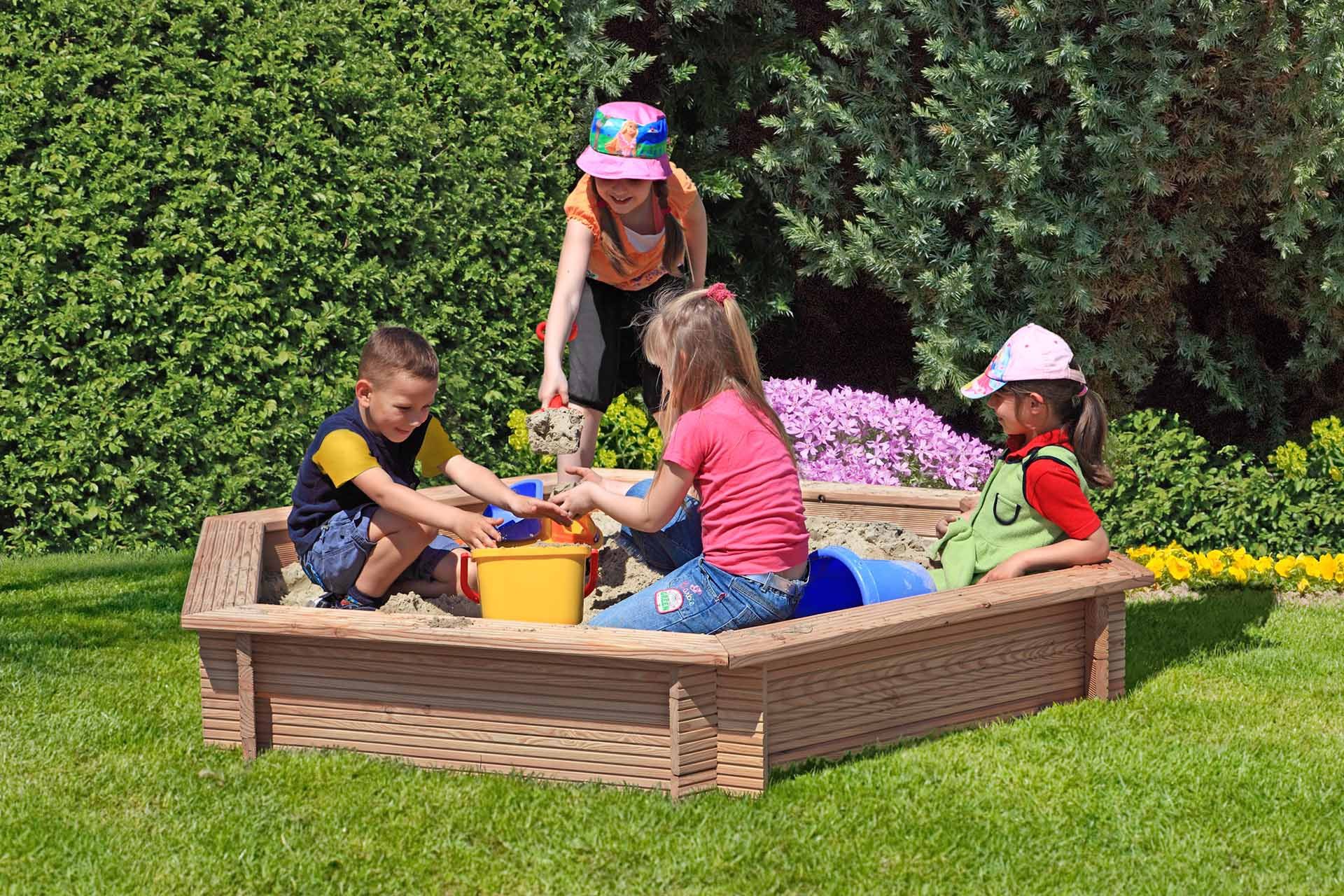 Mega großer Sandkasten - 230 cm im Durchmesser! Selbst beim Kindergeburtstag wird es in diesen Sandkästen nicht zu eng. Schneller Aufbau durch Steckbauweise.