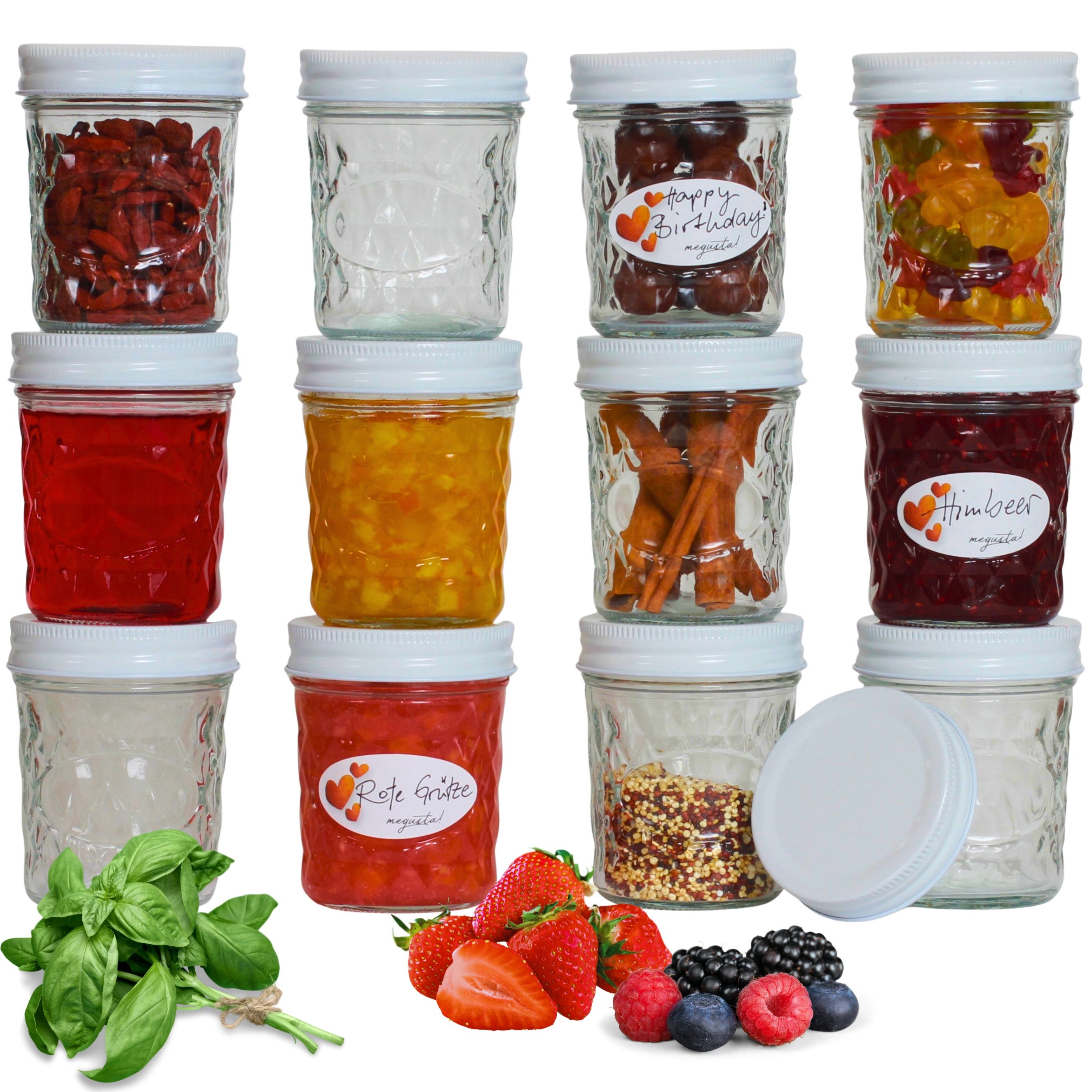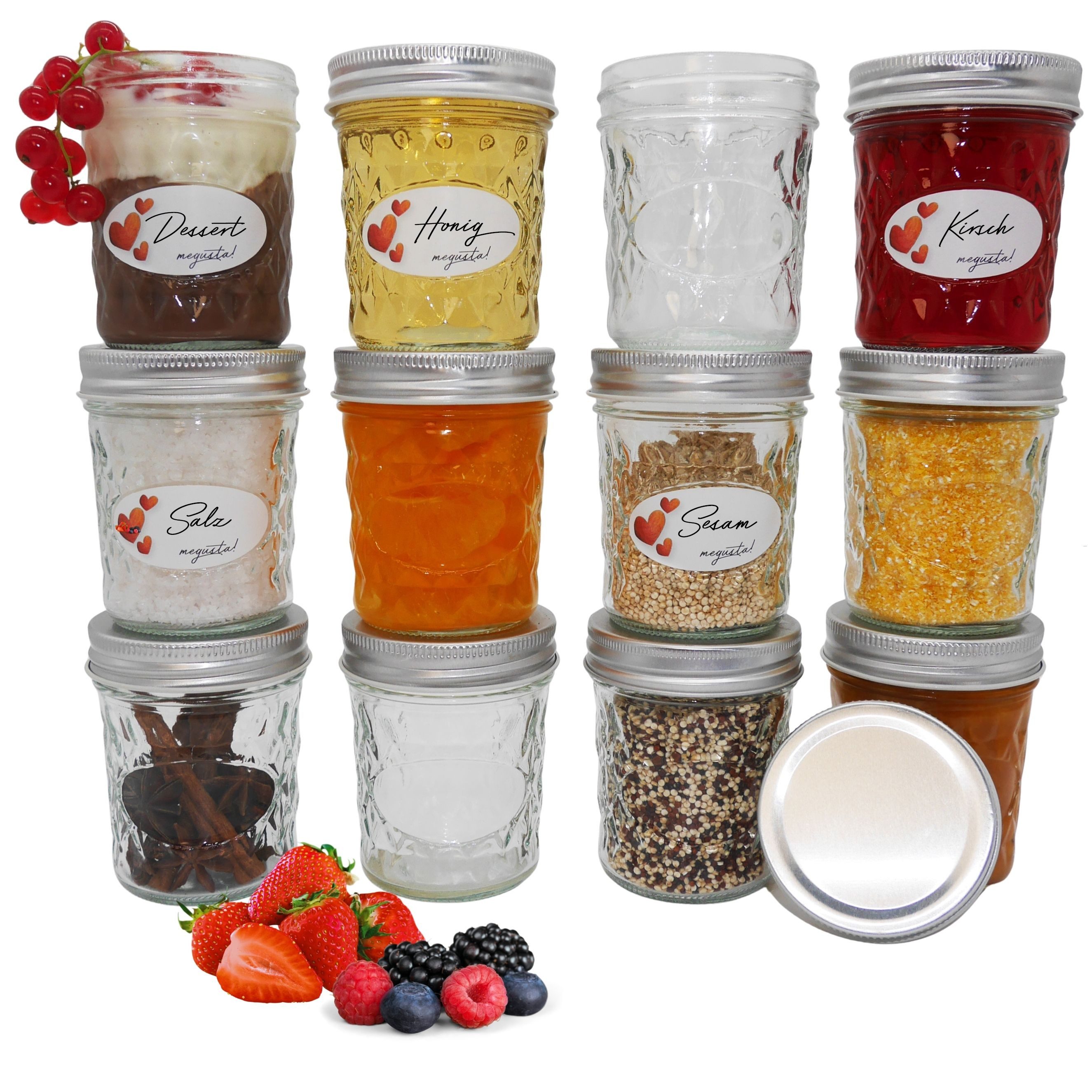 Lieferumfang | 12 Diamantgläser, 12 Aluminiumdeckel nicht-rostend, 16 passende Ettiketten zum Beschriften |