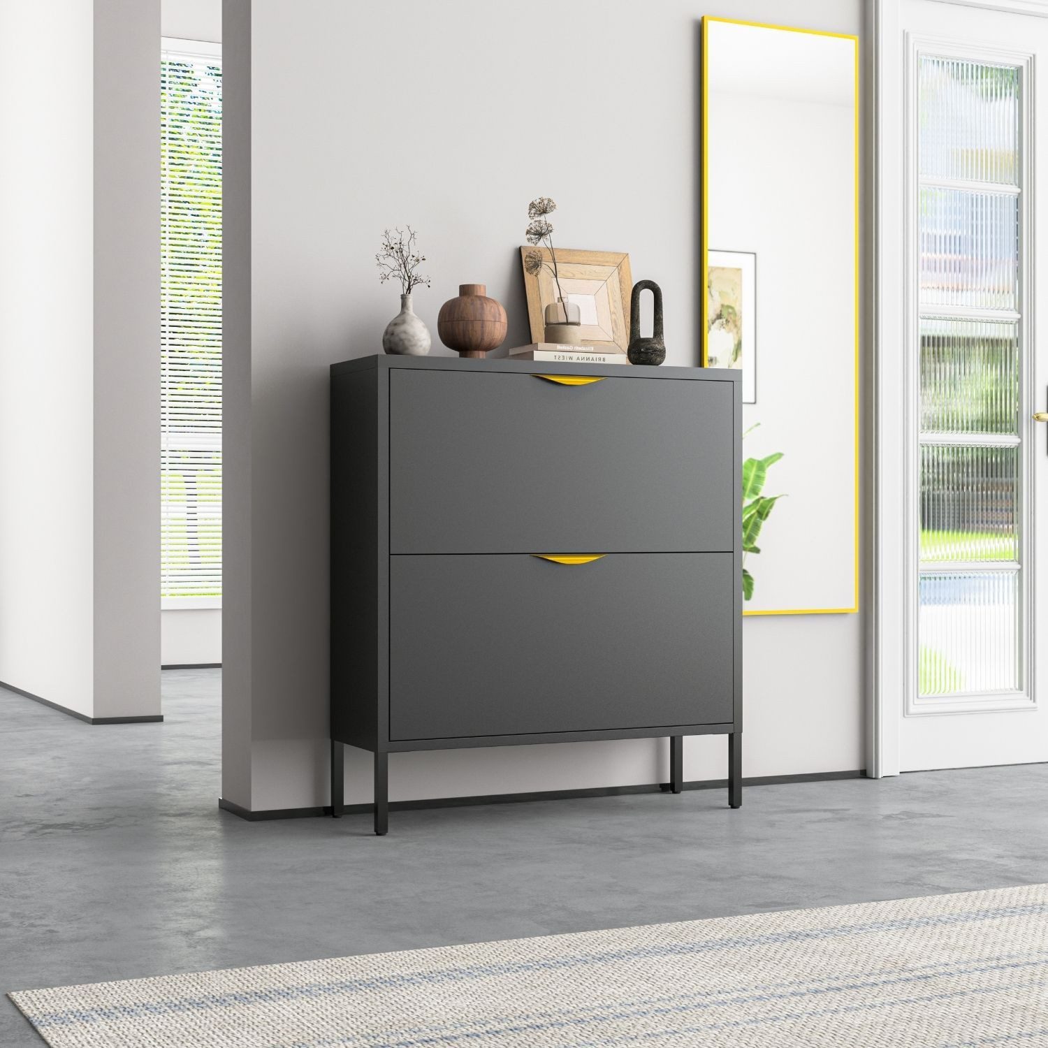 Entdecke den Mein-Regal Schuhschrank Paris – die perfekte Kombination aus Stil und Funktionalität für Deine Schuhaufbewahrung. Hergestellt aus robustem Metall und mit eleganten goldfarbenen Griffen versehen, verleiht dieser Schuhschrank Deinem Eingangsbereich einen Hauch von Luxus. Mit seinen zwei Kippfächern bietet er ausreichend Platz für Deine Lieblingsschuhe und hält diese ordentlich und griffbereit. Das moderne Design des Schuhschranks fügt sich nahtlos in verschiedene Einrichtungsstile ein und wird zum stilvollen Blickfang in Deinem Zuhause. Erwähnenswert ist noch die geringe Tiefe des Korpus. Damit ist der Schrank auch besonders für schmale Flure geeignet. Bringe Ordnung und Eleganz in Deinen Flur mit dem Mein-Regal Schuhschrank Paris.