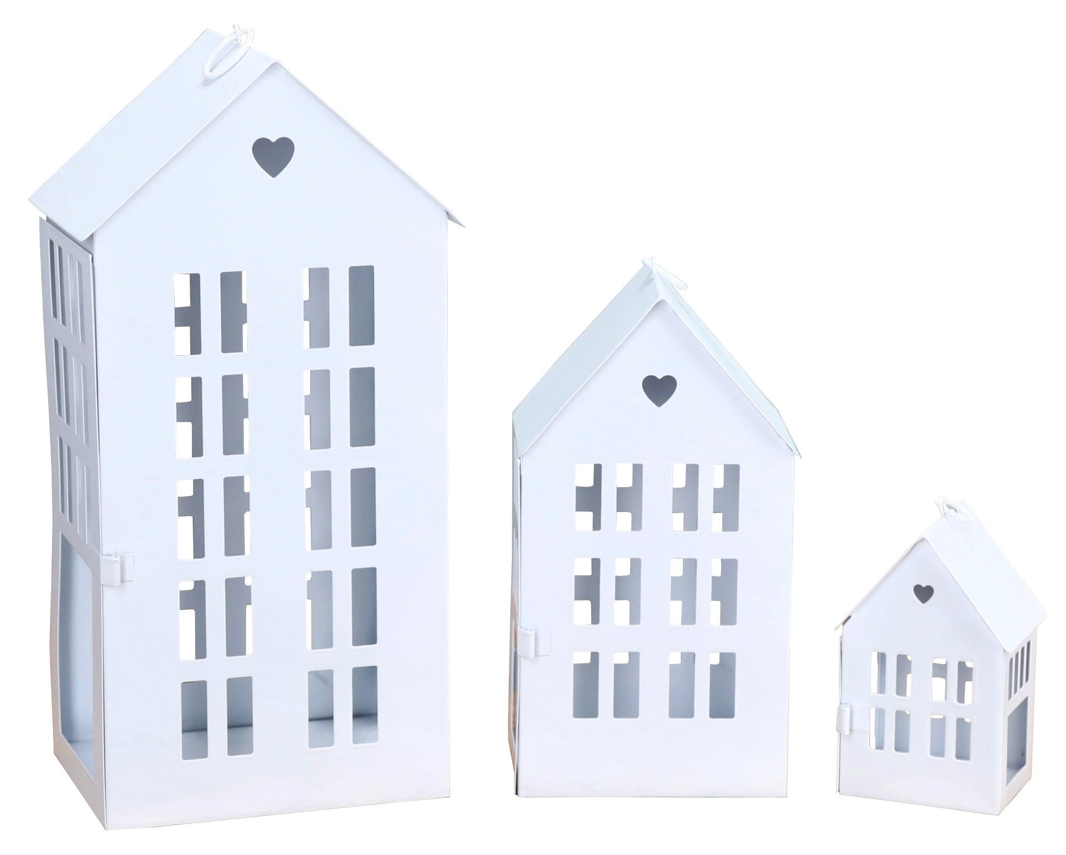 3 schöne weiße Laternenhäuser aus Metall. Die Häuser lassen sich das ganze Jahr über toll dekorieren, ob einzeln auf dem Tisch, im Regal und der Fensterbank oder im Set z.B. auf der Treppe oder der Kommode im Wohnzimmer. Für die Weihnachtszeit lassen sich die Häuser winterlich mit Tanne und Tannenzapfen dekorieren. Zeitloses Design, zaubert gemütliche Stimmung, ganzjährig verwendbar, schöner Hingucker, passt zu vielen verschiedenen Einrichtungsstilen. Auf einer Seite haben die Laternen eine Tür um sie mit Kerzen oder Lichterkette zu bestücken. Die Häuser sind rundherum schön gearbeitet und haben oben einen Aufhängering. Gewicht des 3er Sets, ca.: 1,2 kg Farbe: weiß, matt lackiert Material: Metall Maße, ca.: Kleines Haus: Höhe ohne Aufhängering 13 cm x Breite 8 cm x Tiefe 7,5 cm Mittleres Haus: Höhe ohne Aufhängering 24 cm x Breite 13,5 cm x Tiefe 11 cm Großes Haus: Höhe ohne Aufhängering 35 cm x Breite 17,5 cm x Tiefe 14 cm Lieferumfang: 3er Set Häuser, Lieferung ohne Licht und Deko