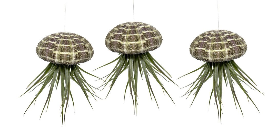 3er Set Seeigelgehäuse mit Aufhängung und jeweils einer echten lebenden Tillandsia ( keine Kunstpflanze ) Handmade in Germany Exotische Deko Exotisches Flair für dein Zuhause Bezaubernde Kombination aus Seeigelgehäuse und Tillandsia Der absolute Hingucker in deinem Zuhause und super pflegeleicht! Eine wunderschöne Deko und exotisch zugleich. Egal wo Du diese tolle Deko auch anbringst, diese Kombination wird in jedem Fall zum Eyecatcher. Auch bestens als Geschenk geeignet ! Jede Luftpflanze ist ein kleines Wunder der Natur. Diese Pflanze lebt von Licht, Luft, einwenig Wasser und benötigt keine Erde. Die Tillandsia ist ursprünglich in Südamerika beheimatet. Dort wächst sie in tropischen und subtropischen Gegenden. Diese wunderbaren Pflanzen freuen sich über einen hellen Standort ohne direkte Sonneneinstrahlung. In Räumen mit hoher Luftfeuchtigkeit fühlen sie sich besonders wohl. Zwei- bis dreimal pro Woche mit kalkarmem Wasser ( gerne auch Regenwasser ) besprüht reicht als Pflege absolut aus. Jede Deko Kombination ist ein Unikat. Nachdem es sich um lebende Pflanzen handelt können diese natürlich einwenig von den Bildern abweichen.