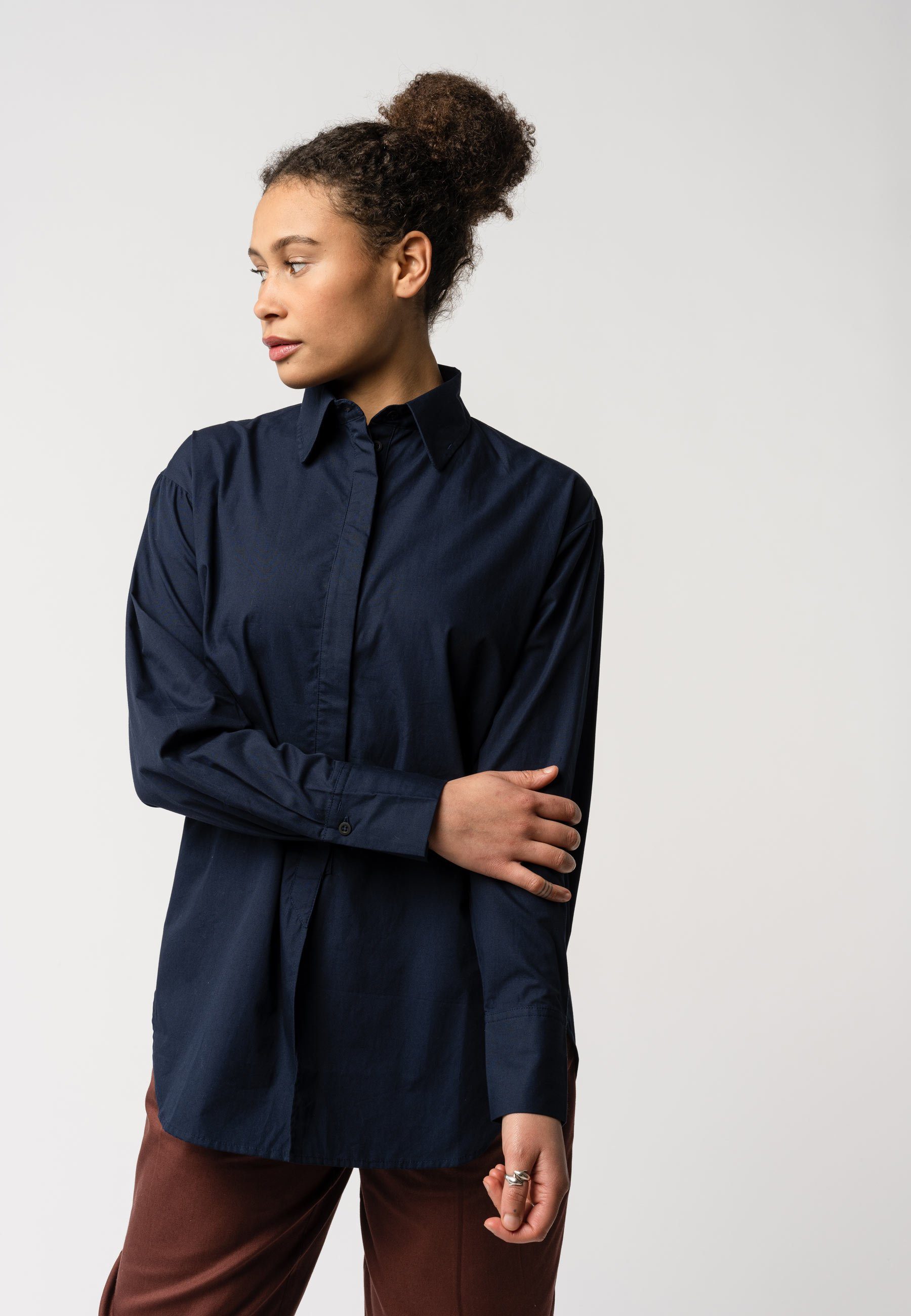 Eine lange, oversized Passform geben unserer Bluse einen stilvollen Look. Finessen, wie eine Kellerfalte, Seitenschlitze und die verdeckte Knopfleiste machen Tanu zu einem klassischen und dennoch modernen Kleidungsstück.