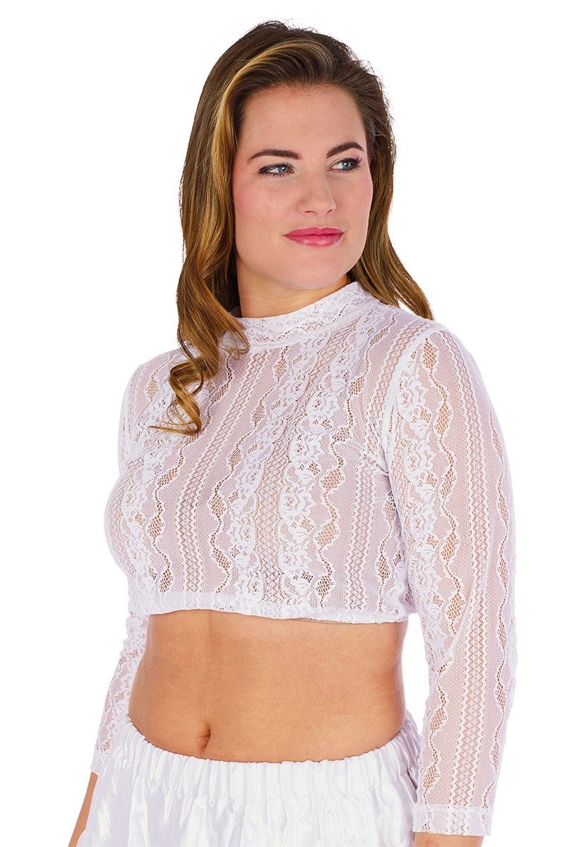 Die märchenhafte, hochgeschlossene Dirndlbluse Malea besteht aus elastischer, semitransparenter Spitze im blumigen Streifen-Design, hat einen doppellagigen Rundhals-Stehkragen, der hinten mit zwei Knöpfen und elastischen Knopfschlaufen geschlossen wird, und 3/4-lange Ärmel. Das romantische Muster ist aus Ornamentik-Ranken und -Blüten, Wellenlinien und floral anmutendem Gittermuster gestaltet. Die Bündchen der zarten Spitzenärmel sind leicht elastisch und für den perfekten Sitz sorgt der elastische Saum. Bitte beachten Sie ab Размер 48 den Größenzuschlag.
