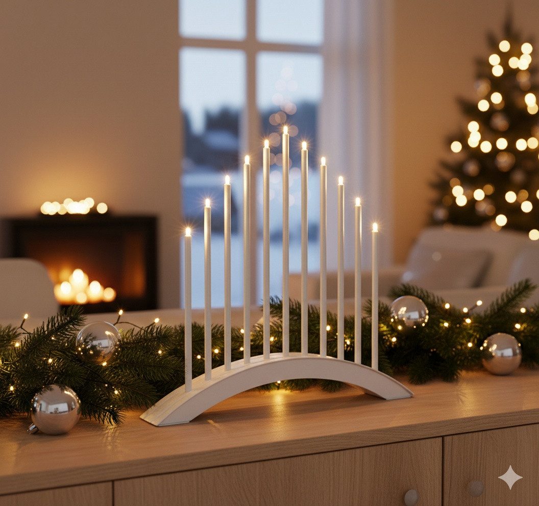 Dieser LED-Stimmungsbogen setzt Ihr Zuhause stimmungsvoll in Szene. Die warmweißen LEDs (3000 K) spenden sanftes, gemütliches Licht – ideal für Advent und Weihnachten, aber auch ganzjährig als modernes Stimmungslicht auf Tisch, Kommode oder Fensterbank. Dank integriertem Akku ist die Leuchte kabellos und nicht standortgebunden. Mit 3 Helligkeitsstufen passen Sie das Licht Ihrer Stimmung an; der 5-Stunden-Timer schaltet automatisch ab. Praktisch: Die Leuchte funktioniert auch während des Aufladens weiter.