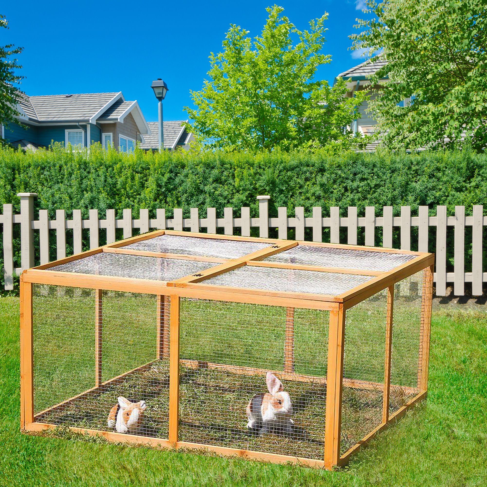Dieses Freilaufgehege besteht aus einer Holz-Gitter-Konstruktion, die sich schnell und einfach im Garten aufstellen läßt. Es wird komplett mit einem halbseitig aufklappbaren Dach abgedeckt, welches zum einen das Herausspringen Ihrer Kaninchen verhindert und zum anderen als Schutz vor Räubern dient. Mit einer Размер von 1,2 x 1,2 m bietet das Gehege genügend Bewegungsfreiheit, um eine artgerechte Tierhaltung zu gewährleisten.