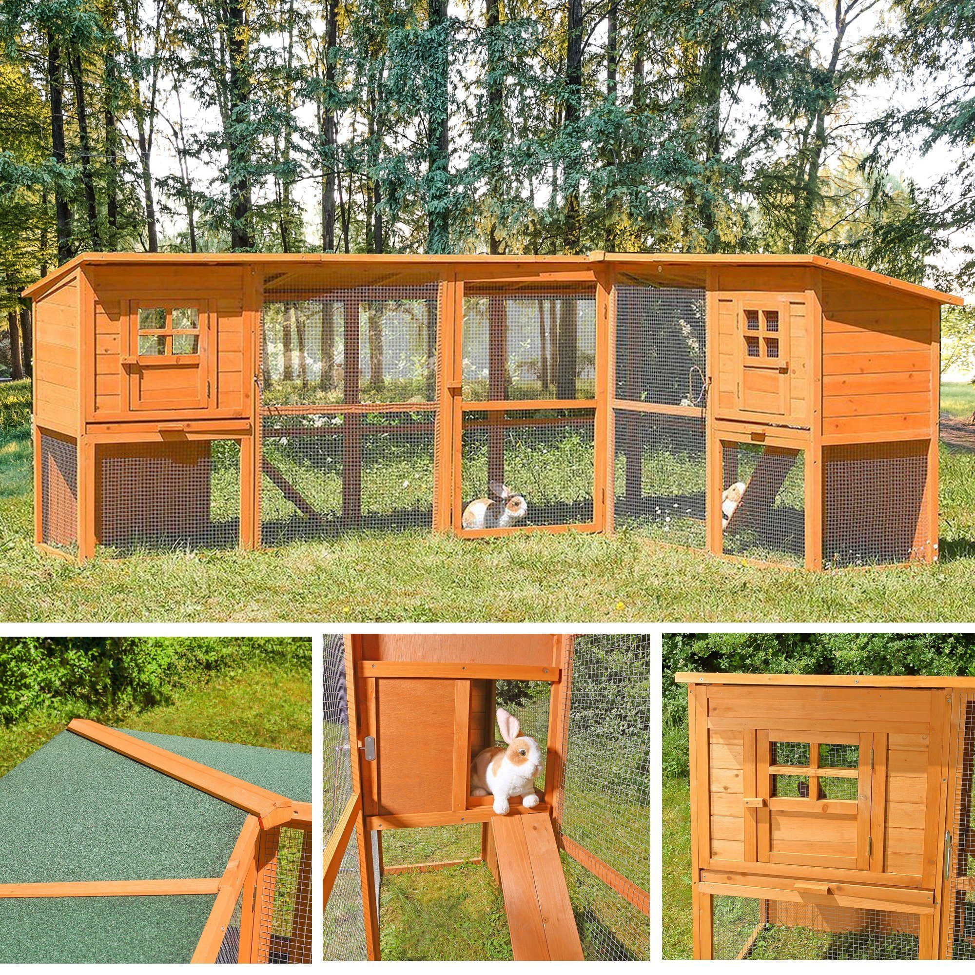 Dieser Kleintierstall bietet Ihren Tieren auf 2 Ebenen enormen Freiraum und Abwechslung! Das gesamte Gehege besteht in der oberen Etage aus 2 separaten, sichtgeschützten Bereichen und unten aus einem schönen, über 2 Leitern frei zugänglichen und sehr geräumigen, bodenfreien Freilaufbereich. Ihre Tiere können hier ungestört und geschützt grasen und die Natur genießen. Der Stall hat viele große und kleinere Gitterfenster sowie eine große Fronttür mit massiven Scharnieren. Die Tiere können von allen Seiten wunderbar beobachtet werden und bekommen genügend Tageslicht und frische Luft. Ihre Hasen oder andere Kleintiere gelangen über die beiden Leitern in ihre oberen, Sicht- und Wettergeschützten Bereiche - der ideale Rückzugsort für Ihre sensiblen Tiere oder die Haseneltern mit ihrem Nachwuchs. Für Sie sind die geschützten Kammern von außen durch jeweils eine Tür bequem erreichbar, so dass Sie jederzeit Zugriff auf den Innenraum bzw. Ihre Lieblinge haben. Das gesamte Dach der Stallvorrichtung ist mit einem speziellen, wasserdichten Belag versehen, damit sowohl Ihre Tiere als auch der Stall selbst vor schlechtem Wetter geschützt sind.