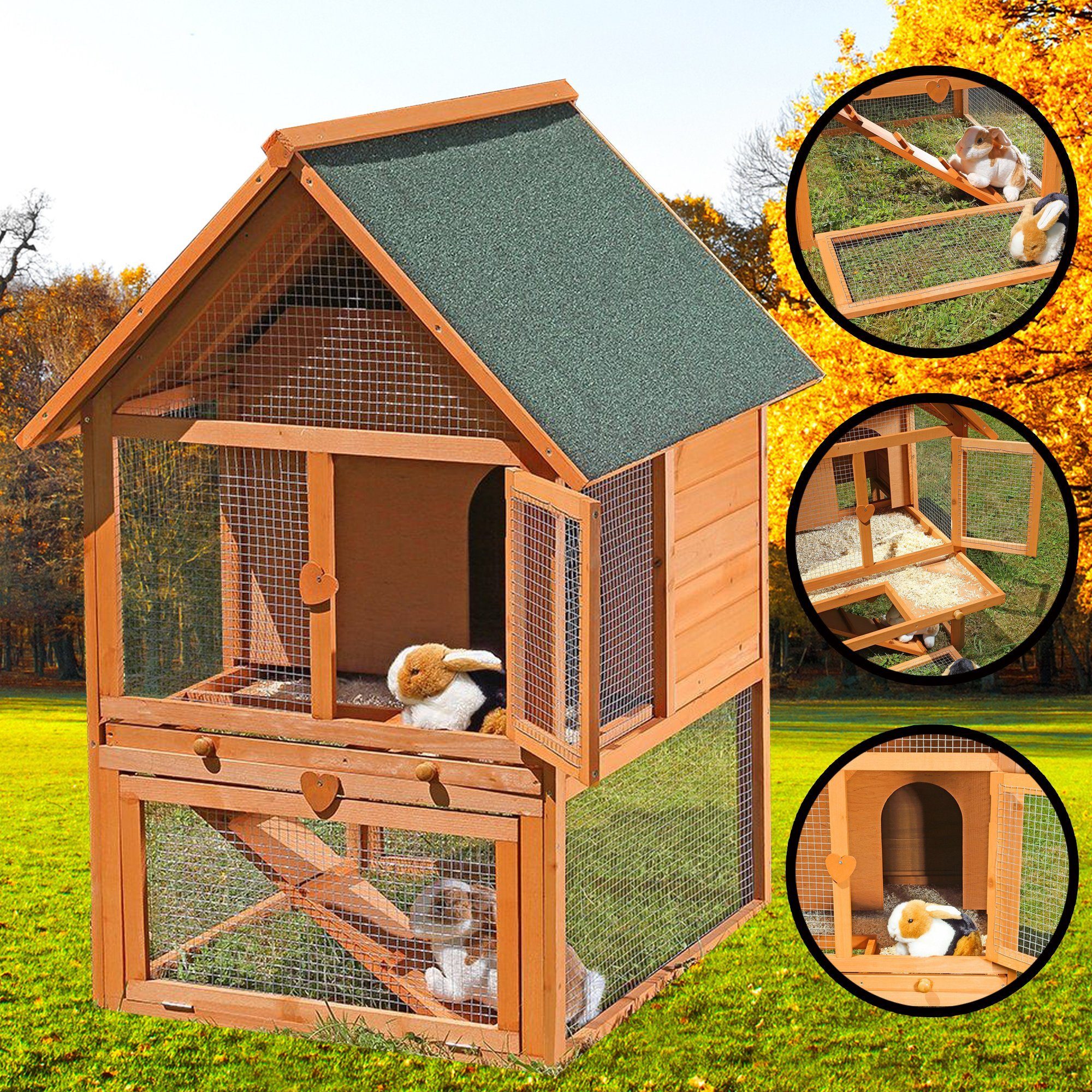 Die 2 Etagen können mit der mitgelieferten Holzrampe verbunden werden, sodass die Tiere sich frei bewegen können. Eine herausnehmbare Schublade erleichtert das Reinigen erheblich. Besonders praktisch: Der untere Boden ist offen, was es den Tieren ermöglicht, direkten Bodenkontakt zu haben und natürlich zu grasen – perfekt für Tierfreunde, die Wert auf artgerechte Haltung legen.