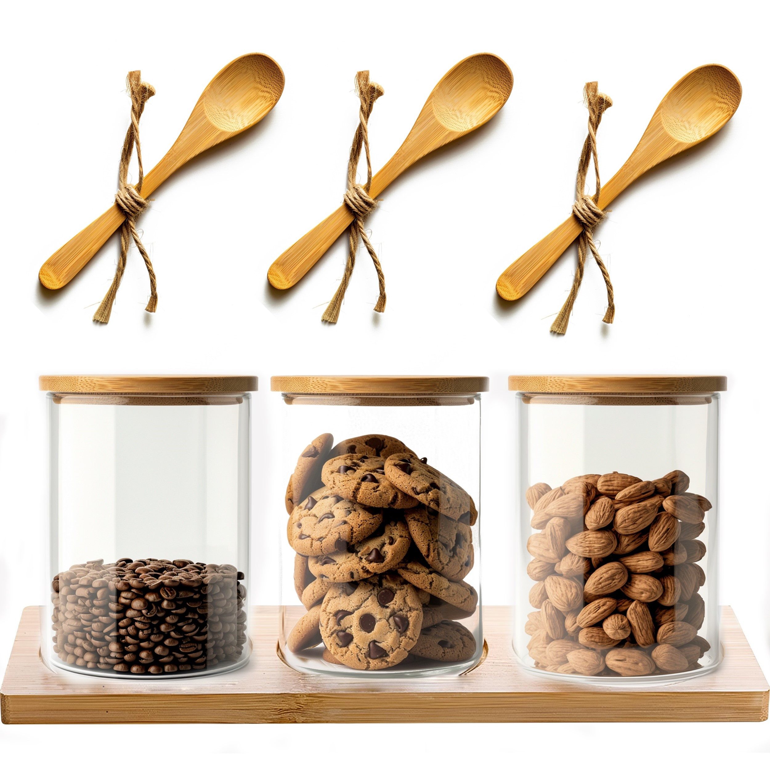 Hitzebeständiges Glas, mit praktischen Holzdeckeln und Löffeln. Tolle Geschenkidee und ein kleiner Küchenhelfer. Organisieren Sie Ihre Küche übersichtlich.