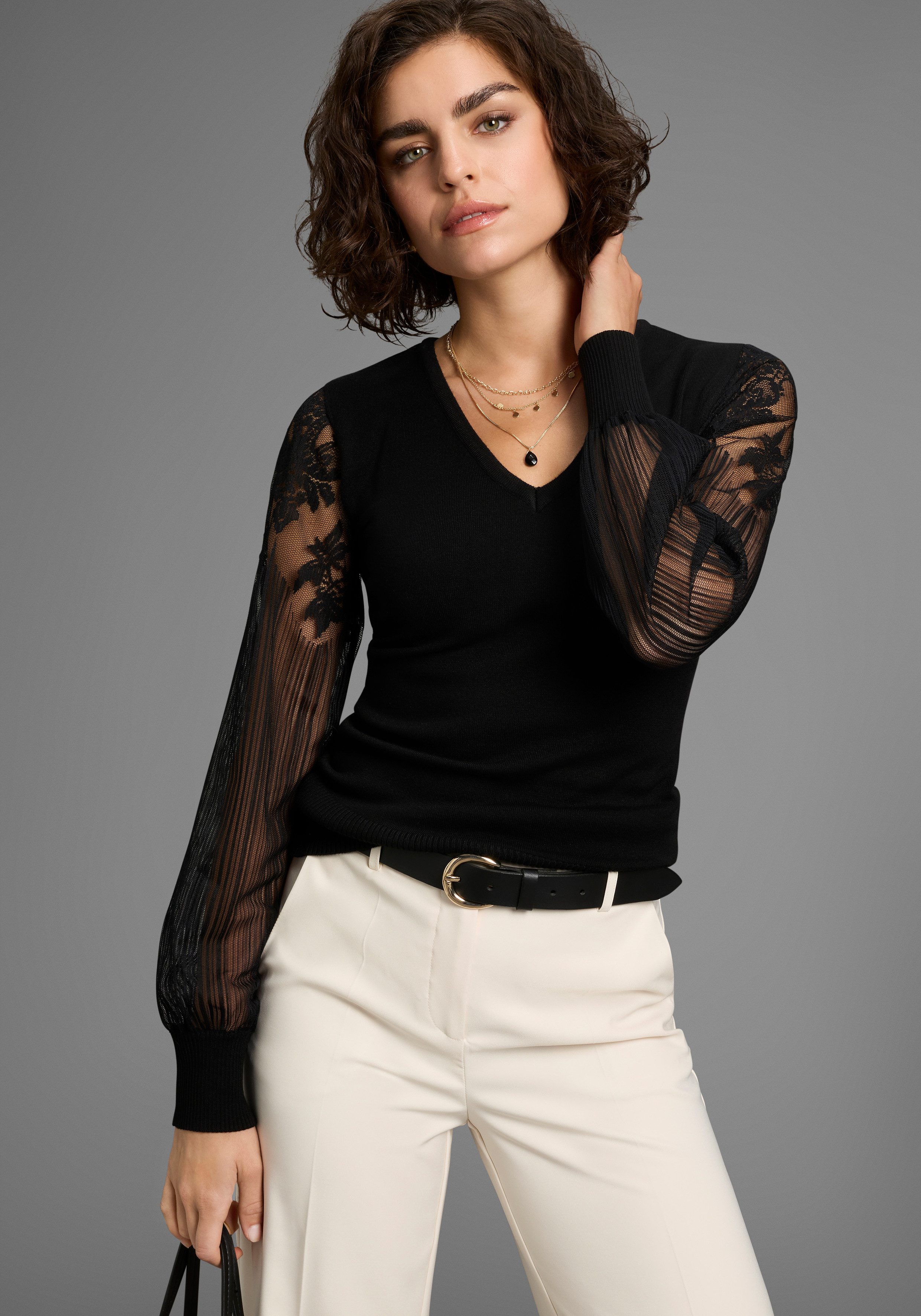 Der V-Ausschnitt-Pullover von Melrose wird dein neues Feel-good-Oberteil für zu Hause und an kalten Tagen. Er wirkt mit der Spitze zauberhaft und trendy. Die langen Ärmel enden in einem Rippstrickbündchen, das für guten Sitz sorgt. Dieser Pullover ist hüftbedeckend sowie figurbetont geschnitten, sodass er deinen Oberkörper schön zur Geltung bringt.
