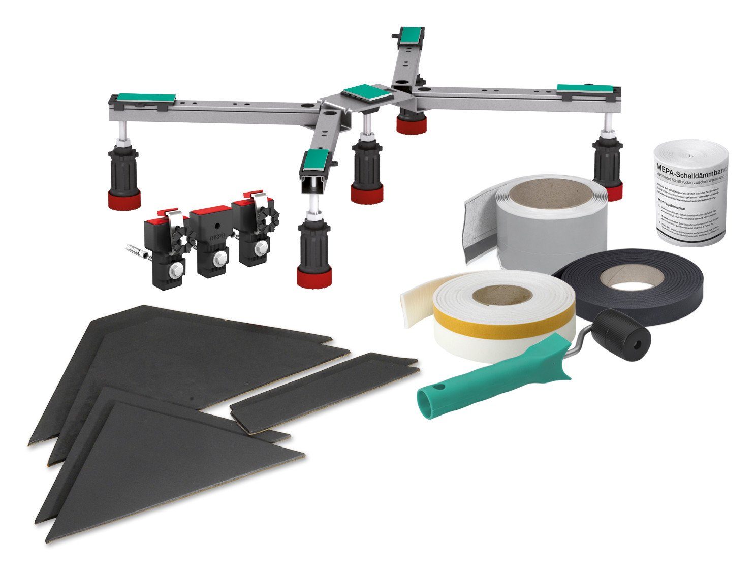 Set zum schalldämmenden Einbau von Duschwannen aus Stahl. Nachgewiesener Schallschutz per Schallgutachten, erfüllt die Anforderung zum Schallschutz nach DIN 4109, VDI 4100.
