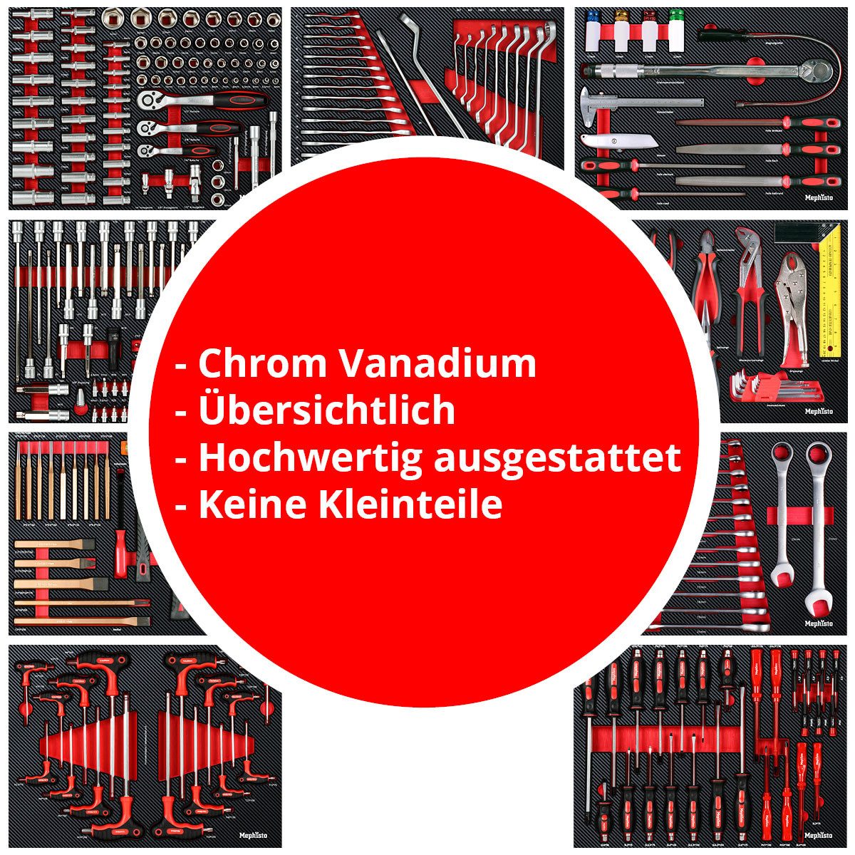 Ein Merkmal, welches unseren Werkzeugwagen zu einem absoluten Top-Produkt in Bezug auf das Preis-Leistungsverhältnis macht, ist die Verwendung von Chrom-Vanadium-Stahl für unsere Werkzeuge. Zu beachten ist, dass es sich bei einer Reihe der günstigeren oder auch gleichpreisigen bzw. auch teureren Werkzeugwagen um keinen Chrom-Vanadium-Stahl handelt. Hier wird oft für das Werkzeug die deutlich günstigere und auch in ihren Eigenschaften, deutlich schlechtere Варианты mit unlegiertem Stahl / Kohlenstoffstahl verwendet.