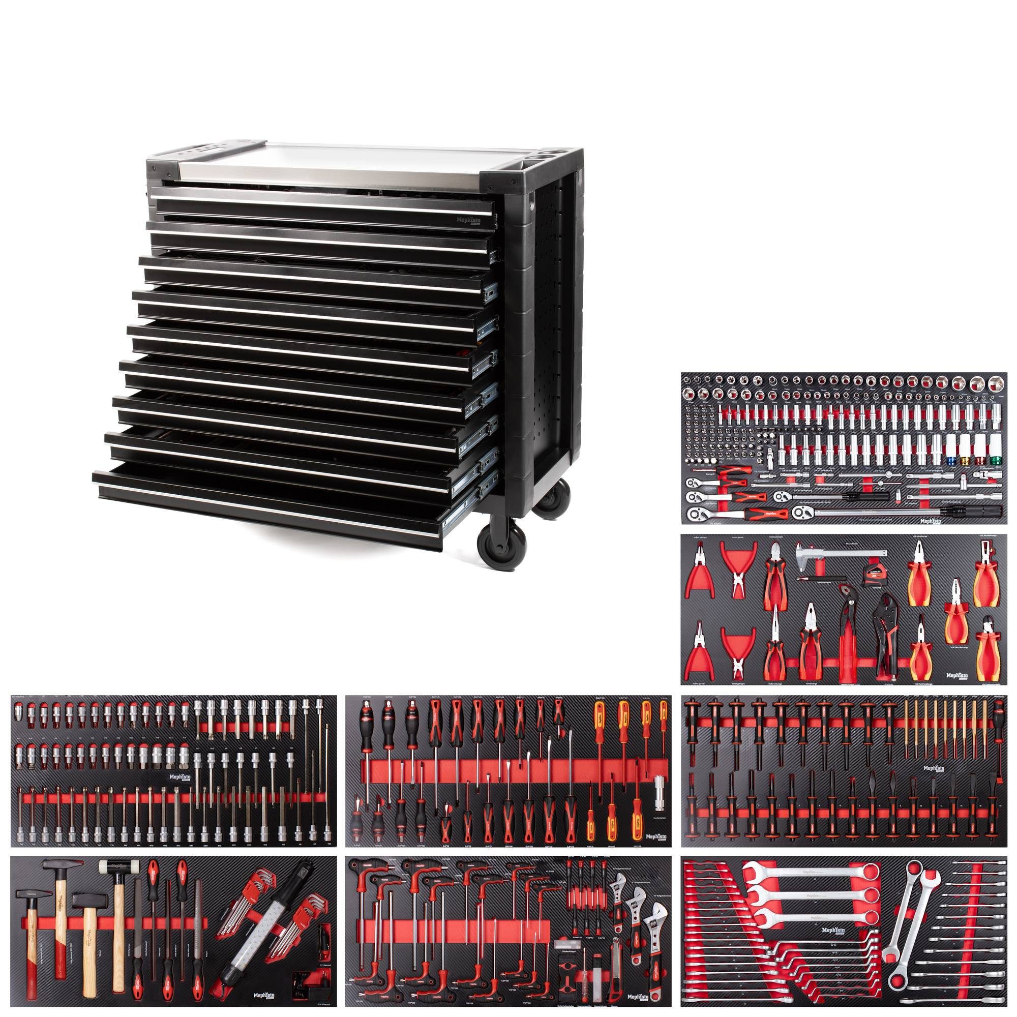 Ausstattung | 9 Schubladen befüllt mit hochwertigen Werkzeugen, ordentlicher Schiebegriff, Werkzeugeinlagen aus flexiblem Schaumstoffmaterial |