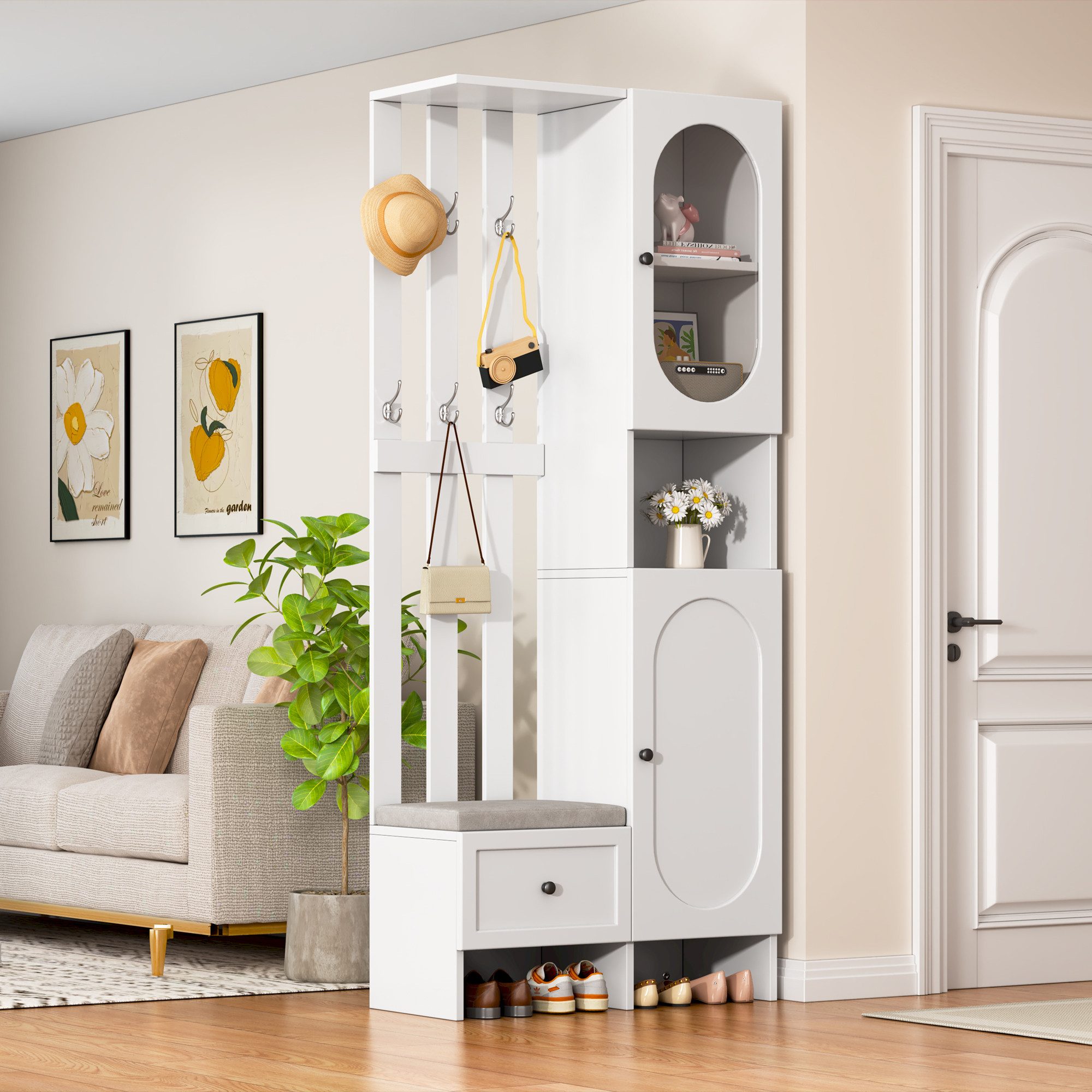 Verkaufsargumente: Multifunktional mit Kleiderhaken, 2 Schränken, 1 Schublade, 10 Ablageflächen, Schuhbank mit Polster
