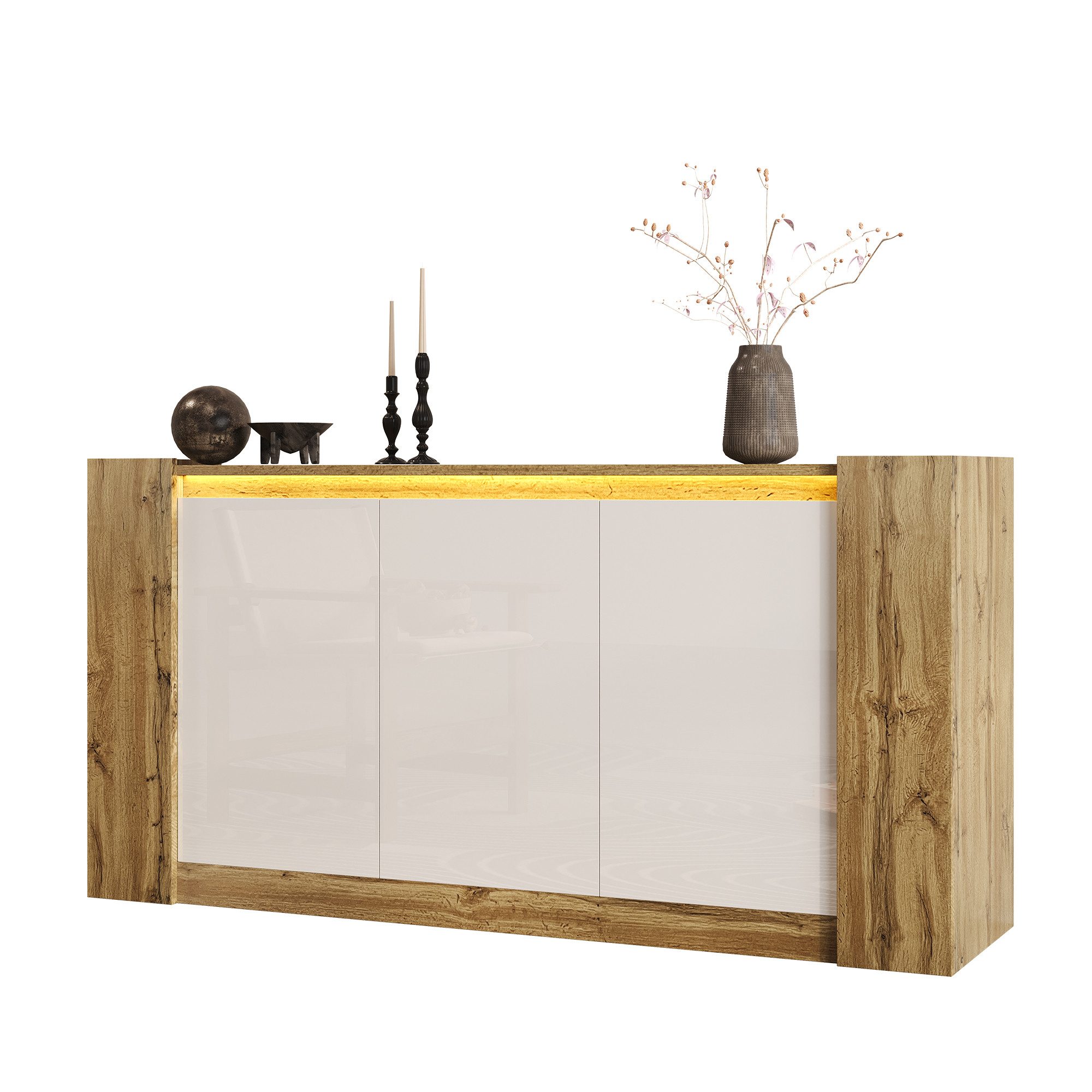 Das Merax Sideboard verbindet modernes Design mit praktischer Vielseitigkeit. Die grifflosen Hochglanzfronten in Weiß kontrastieren harmonisch mit warmen Holztönen, während die integrierte LED-Lichtleiste das Möbelstück stilvoll in Szene setzt. Soft-Close-Scharniere und individuell verstellbare Regale machen das Sideboard nicht nur optisch attraktiv, sondern auch funktional für den Alltag. Ideal für Wohn- oder Esszimmer.
