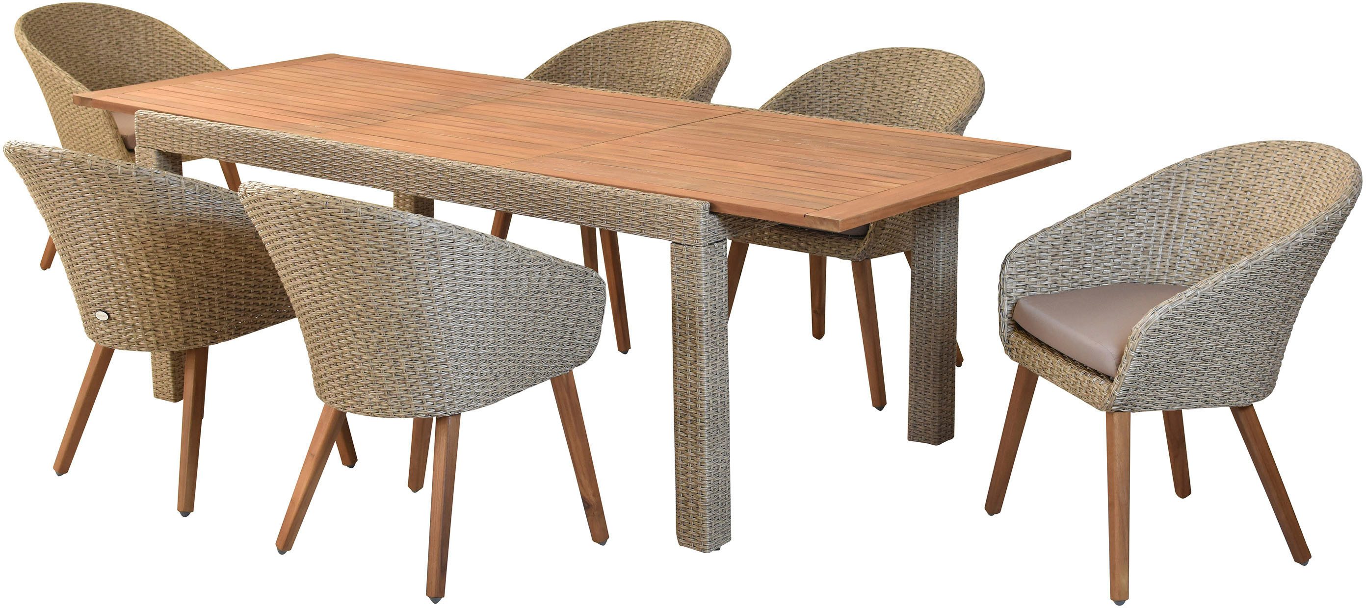 Set beinhaltet | 6 Sessel, 6 Sitzkissen, 1 Ausziehtisch |