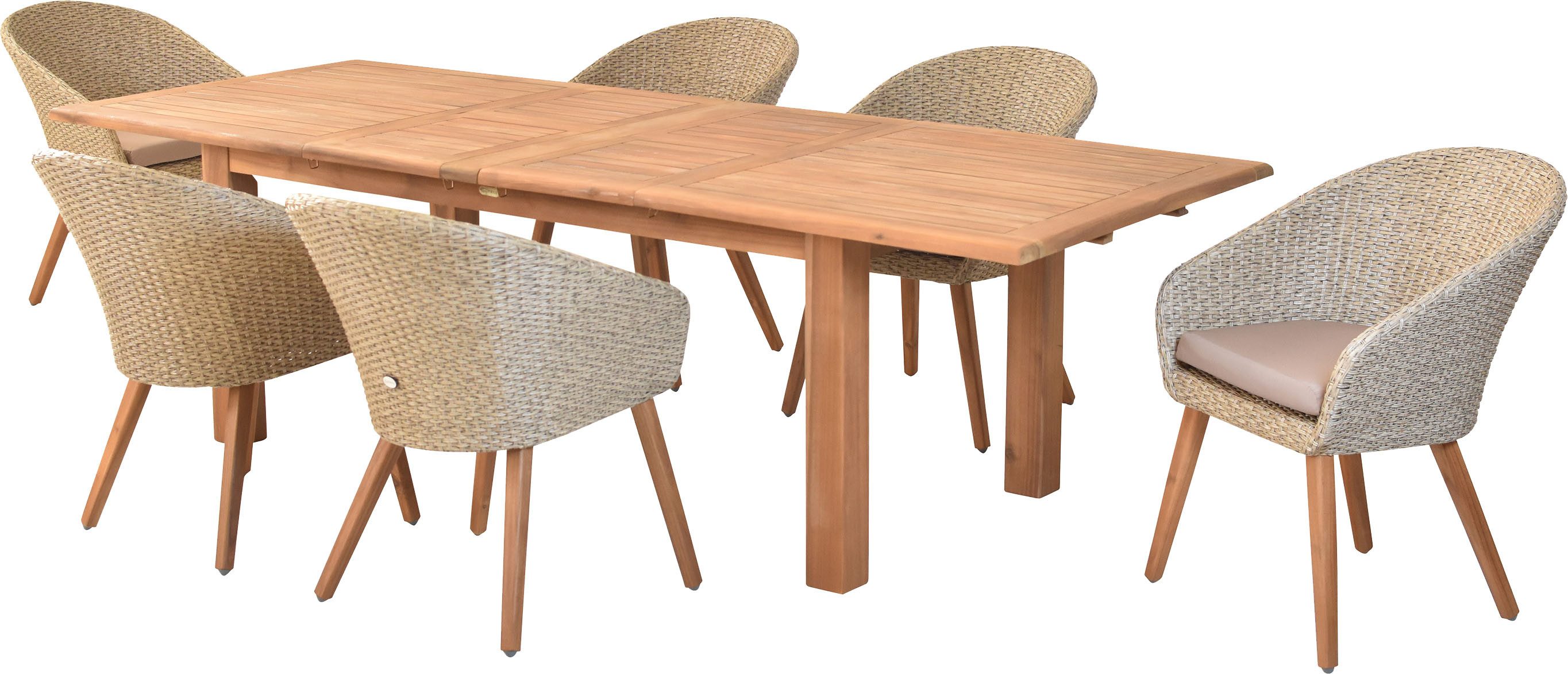 Set beinhaltet | 6 Sessel, 6 Sitzkissen, 1 Doppelausziehtisch |