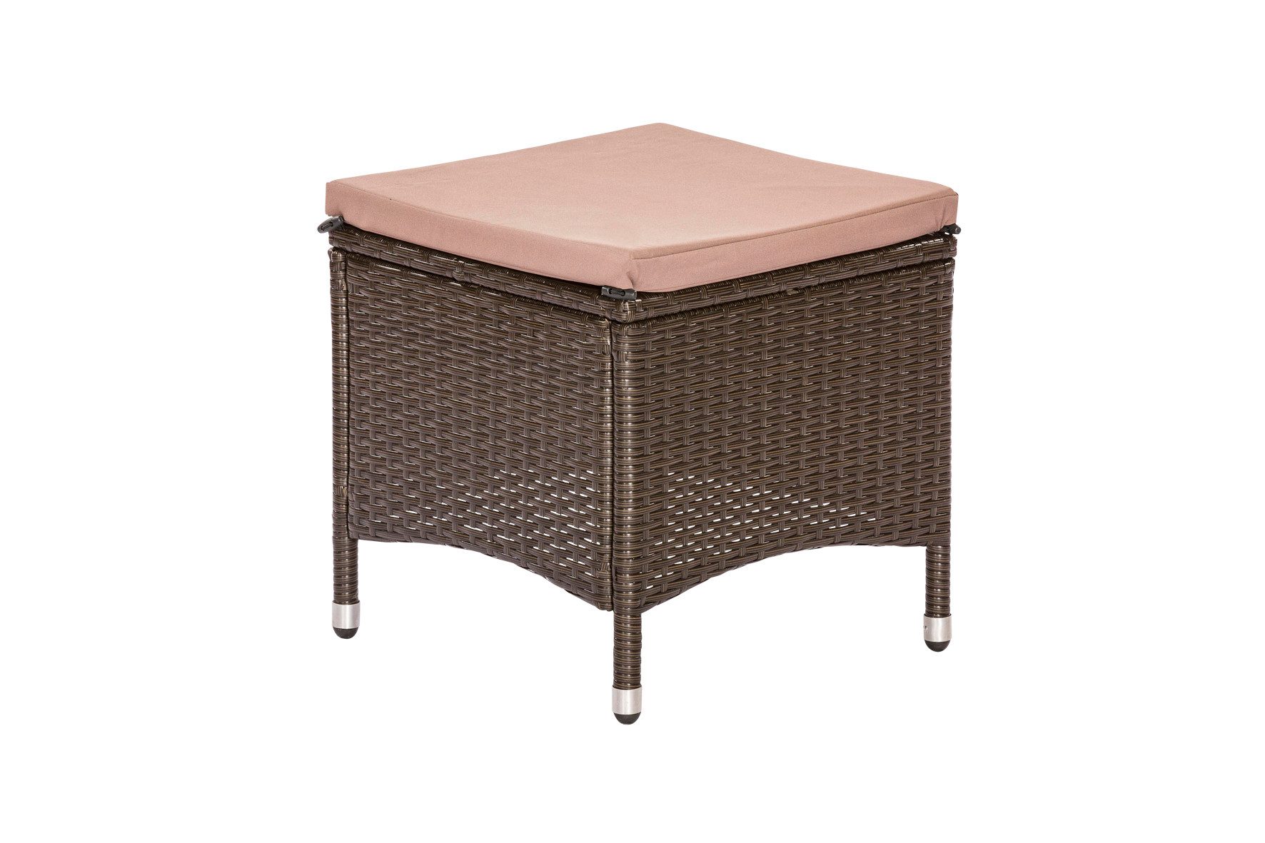 Robuster Sitzhocker MONACO 45x45x45cm. Der Rahmen des Hockers besteht aus einem stabilen Stahlkern. Die Bespannung besteht aus Polyrattan, Farbe braun. Im Lieferumfang ist ein bequemes Sitzpolster in der Farbe beige enthalten, Stärke 4cm. Material Bezüge: 100% Polyester. Maße: Breite: 45cm Tiefe: 45cm Höhe: 45cm Sitzbreite: 45cm Sitztiefe: 45cm Sitzhöhe: 45cm (ohne Polster) Dicke Sitzpolster: 4cm
