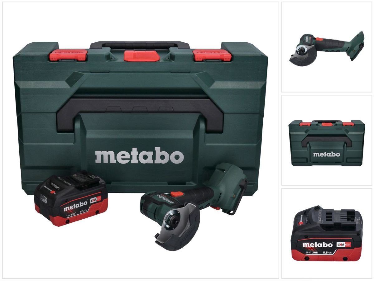 Das Elektrowerkzeug eignet sich zum Schleifen, Sandpapierschleifen, Arbeiten mit Drahtbürsten und Trennschleifen von Metall, Beton, Stein, Fliesen, Holz, Kunststoffen und ähnlichen Materialien ohne Verwendung von Wasser. Der handliche Akku-Winkelschleifer überzeugt mit maximalen Arbeitskomfort für viele Anwendungen insbesondere an engen Stellen. Außerdem beugt seine kompakte Bauweise und sein leichtes Gewicht Ermüdigungserscheinungen vor. Der kraftvolle bürstenlose Motor des Winkelschleifers sichert schnellen Arbeitsfortschritt und höchste Effizienz. Der eingebaute Überlastschutz schützt den Motor vor Überhitzung. Der Wiederanlaufschutz verhindert das unbeabsichtigte Anlaufen des Geräts nach Akkuwechsel. Metabo liefert das passende Zubehör, eine große Auswahl an Scheiben zum Bearbeiten von Metall, Holz, Stein, Fliesen und Kunststoff. Das Zusammenspiel aufeinander abgestimmter Technologien, wie z.B. ein intelligentes Batteriemanagement und die permanente elektronische Einzelzellenüberwachung sichern eine besonders lange Lebensdauer des 5,5 Ah Akku. Die extrem robuste, bruchsichere MetaLoc mit breitem Tragegriff und der passenden Einlage bietet Platz für den Winkelschleifer, ein Ladegerät, zwei Akkus und Trennscheiben.