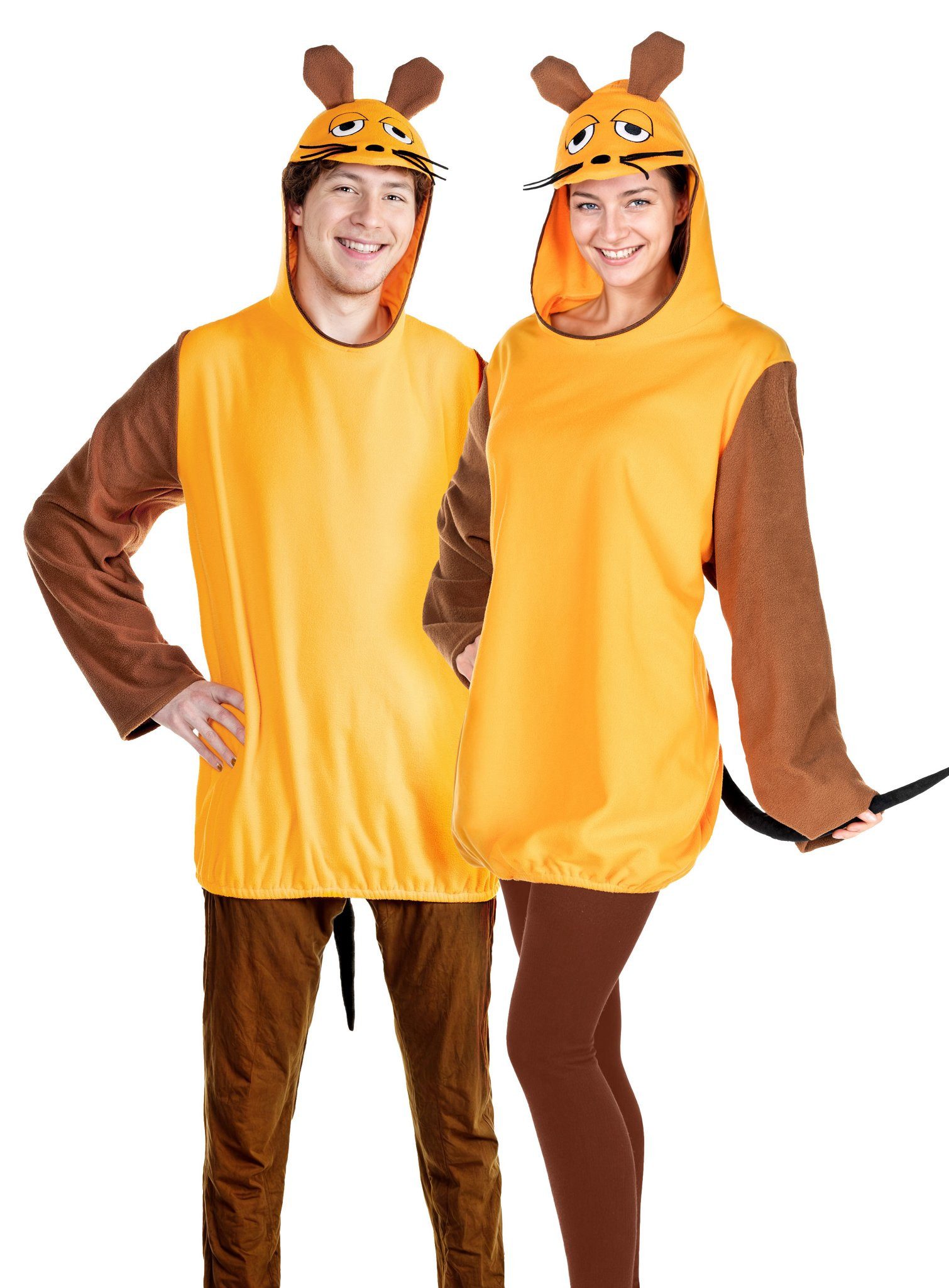 Das Mauskostüm besteht aus einem weit geschnittenen und damit äußerst bequemen Oberteil mit langen Armen und Kapuze. Es ist in genau den gleichen Orange- und Brauntönen gehalten wie die originale Maus und hinten ist natürlich auch der schwarze Mauseschwanz angebracht. Die große Kapuze bietet viel Platz und ist von außen mit Augen und Nase der Maus bedruckt, während die schwarzen Schnurrhaare und die braunen Mausohren angenäht sind. Du brauchst also nur noch hinein zu schlüpfen und schon kannst Du als Maus auf Sendung gehen!