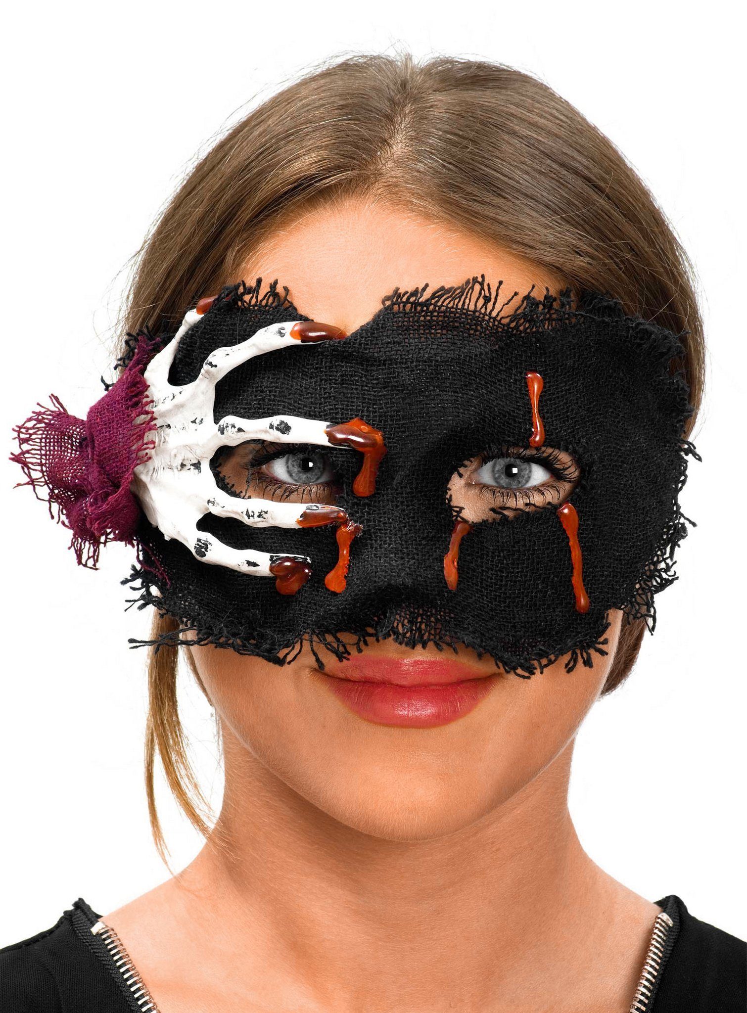 Originelle Augenmaske für mysteriöse Auftritte: schwarze Halbmaske aus groben Leinen mit zerrissenen Säumen, Skeletthand und Blutstropfen. Ein elastisches Gummiband sorgt für bequemen Sitz der Maske.