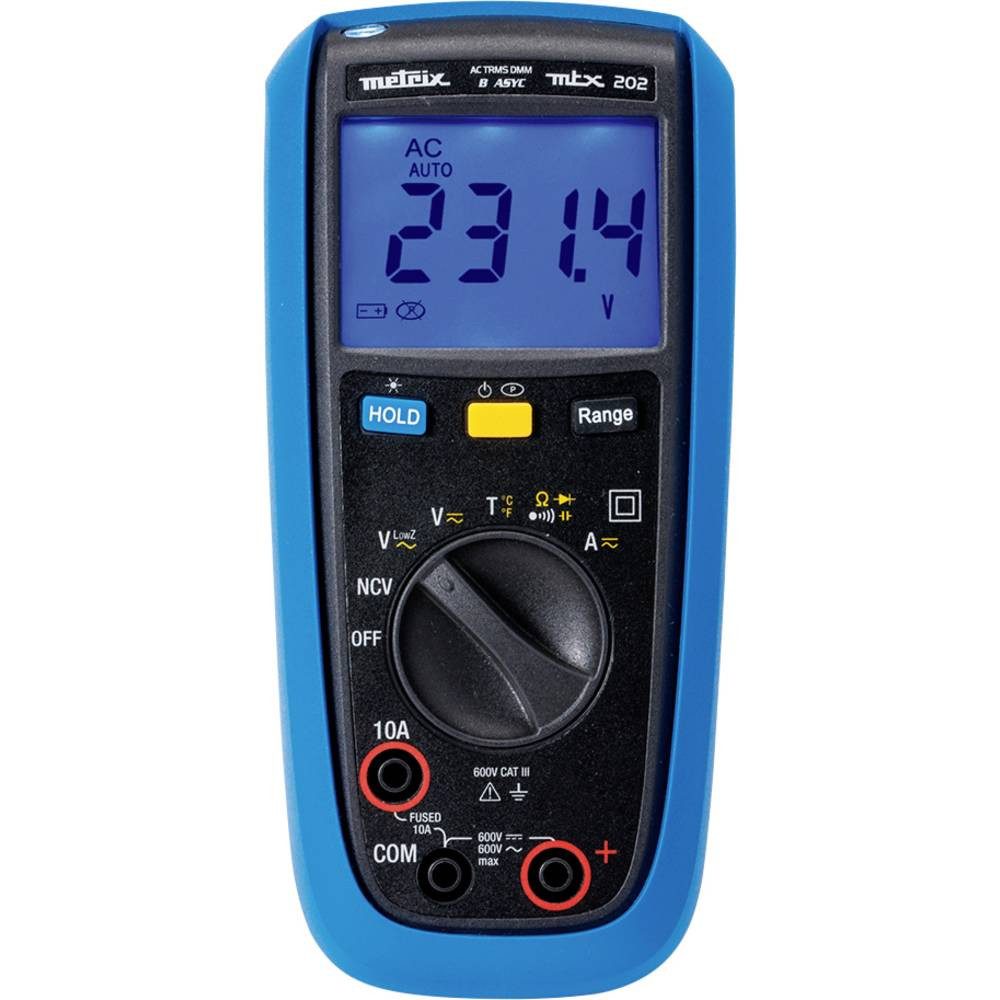 MTX 202-Z Multimeter in Blister-Verpackung, 1 Stoßschutzhülle, 1 Messleitung 1,5 m Winkelstecker Ø 4 mm / Prüfspitze CAT III 600 V rot,, 1 Messleitung 1,5 m Winkelstecker Ø 4 mm / Prüfspitze CAT III 600 V schwarz,, 1 K-Thermoelement-Fühler, flexibles Kabel mit Ø 4 mm-Adapter, 1 Bedienungsanleitung auf Papier,, 2 Batterien 1,5 V AA