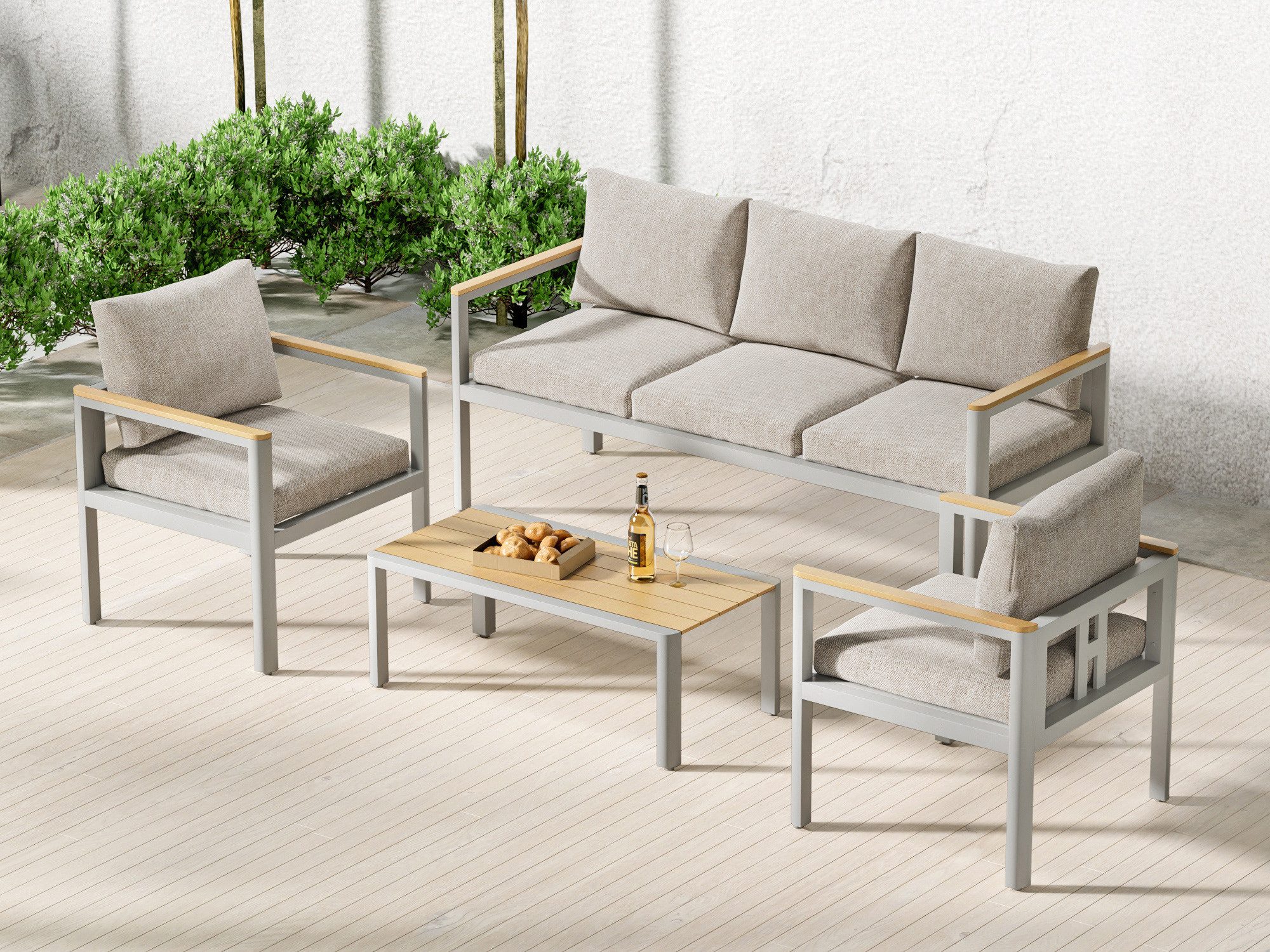 Herzstück des Ensembles ist das großzügige 3-Sitzer-Sofa, ergänzt durch zwei komfortable Loungesessel und einen rechteckigen Couchtisch mit pflegeleichter Polywood-Tischplatte in eleganter Teakholz-Optik. Diese Kombination schafft einen einladenden Ort zum Entspannen, Genießen und Zusammensitzen mit Familie oder Freunden.