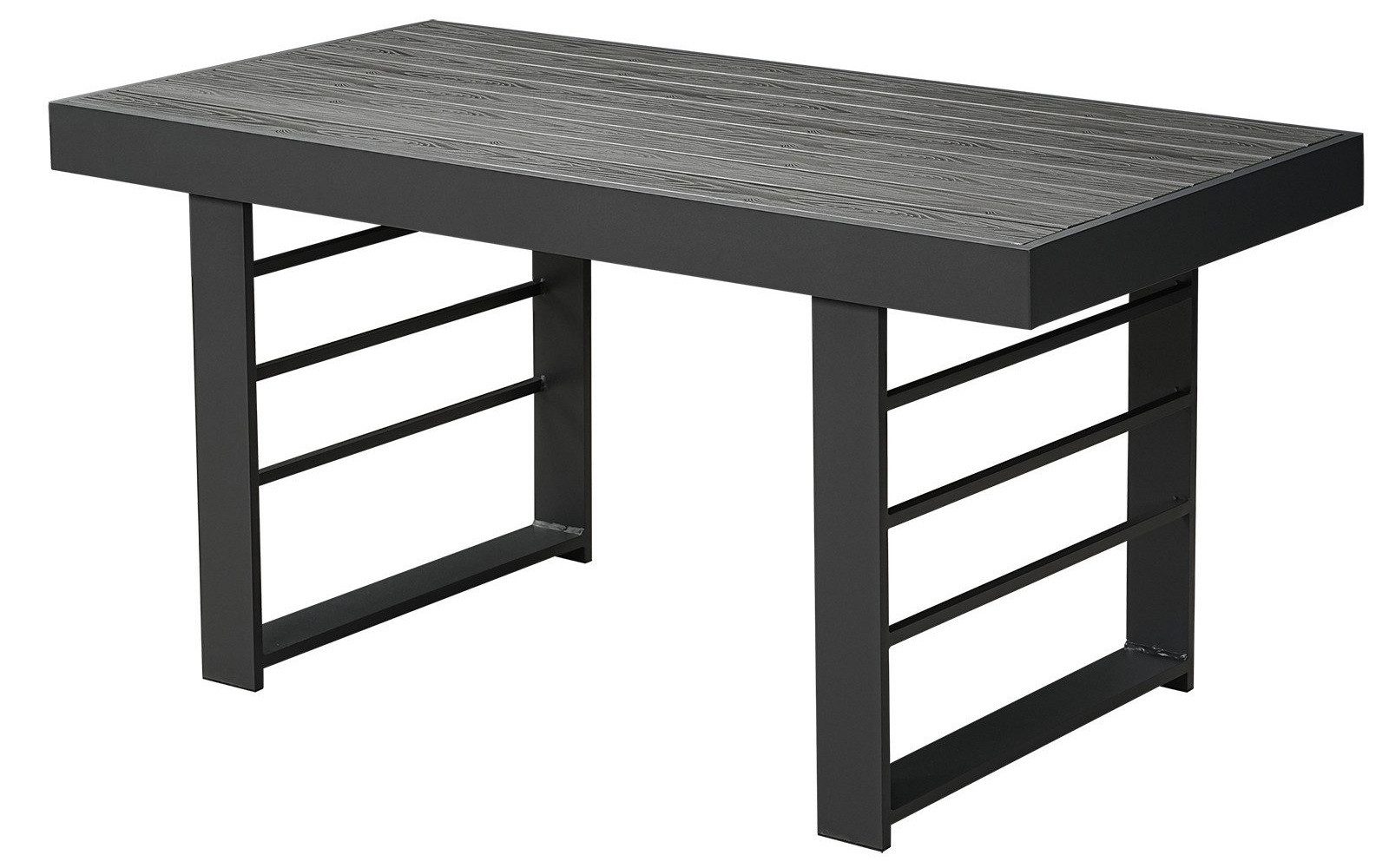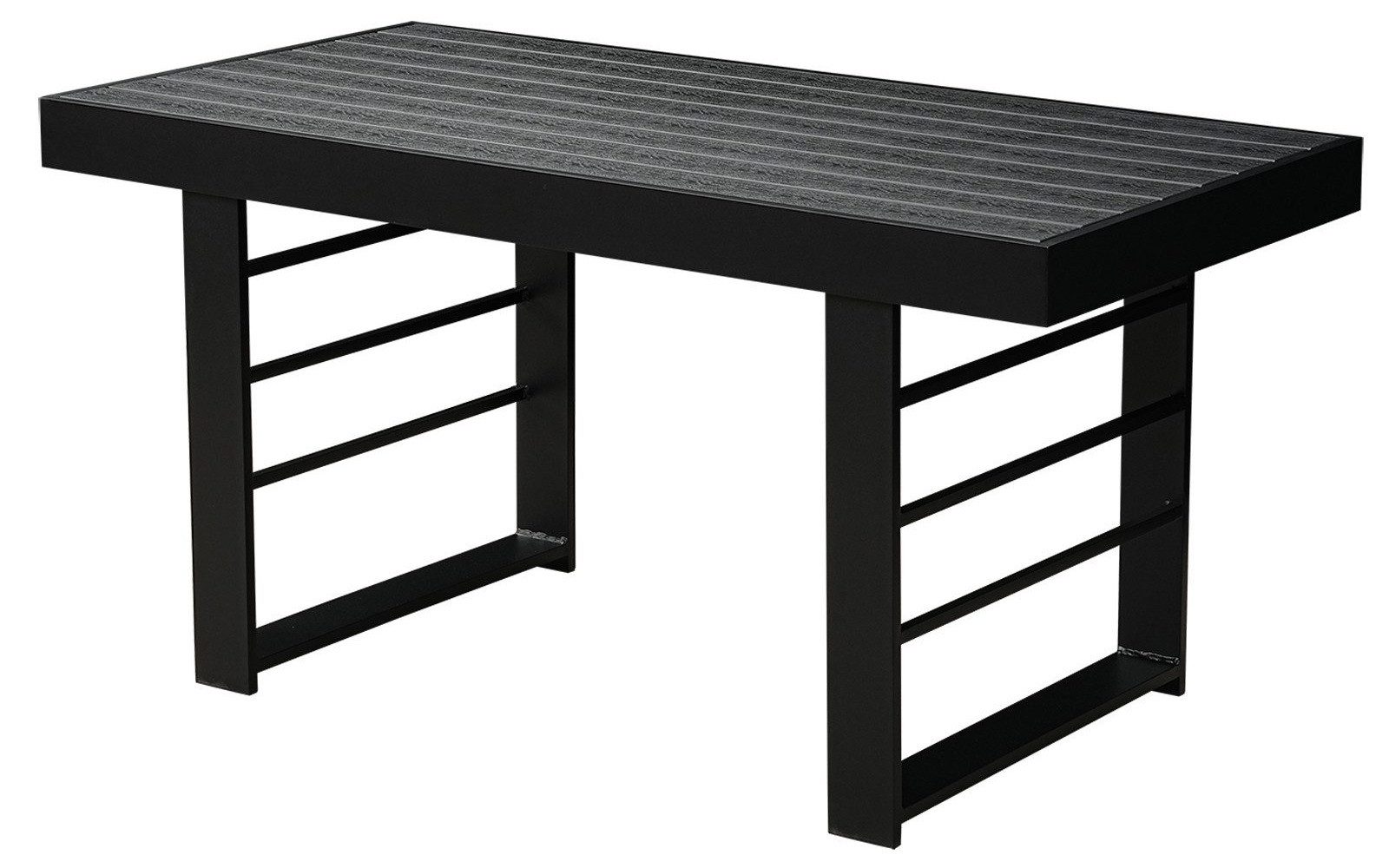 Die Tischplatte ist aus einem Holz-Polymer-Verbundwerkstoff (WPC) gefertigt, was nicht nur schön aussieht, sondern auch abriebfest und kratzfest ist. Zwischen den einzelnen Holzleisten wurden Zwischenräume belassen, um zu verhindern, dass Wasser eindringt, und die Reinigung zu erleichtern.