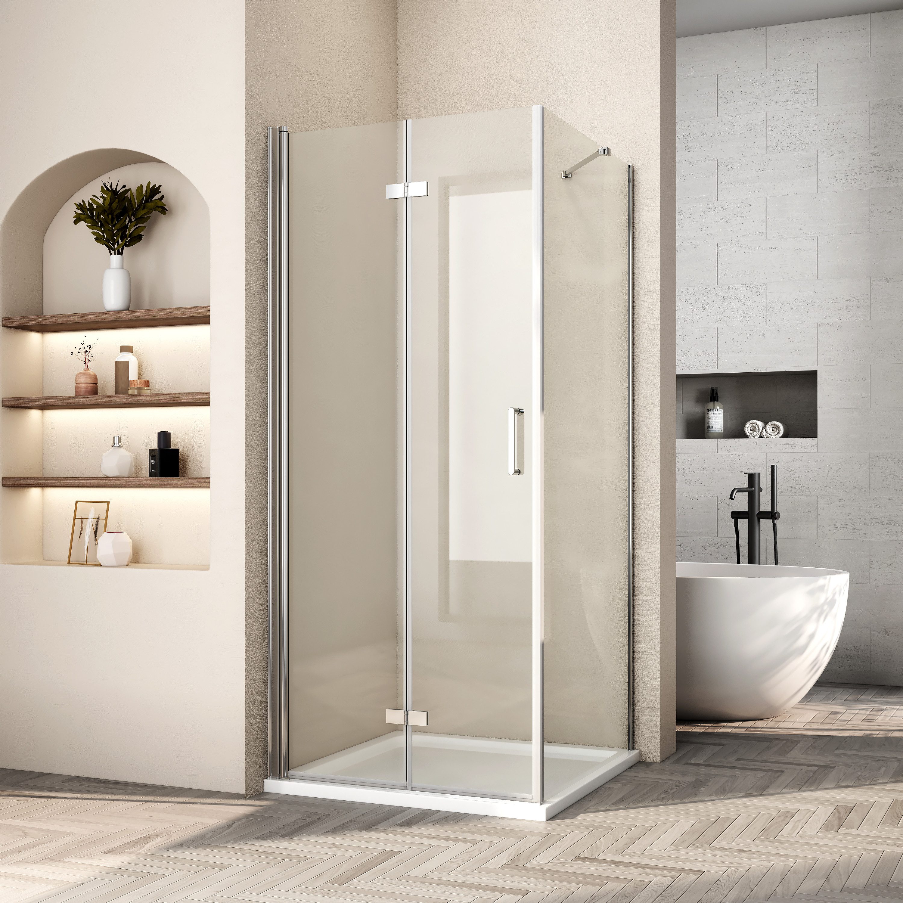 Hinweis: Die Breite und Tiefe beziehen sich auf die Abmessungen der Duschwanne, die zur Duschkabine passt. Den tatsächlichen Einstellbereich der Tür entnehmen Sie bitte den folgenden Daten( Das Paket enthält keine Duschwanne.)