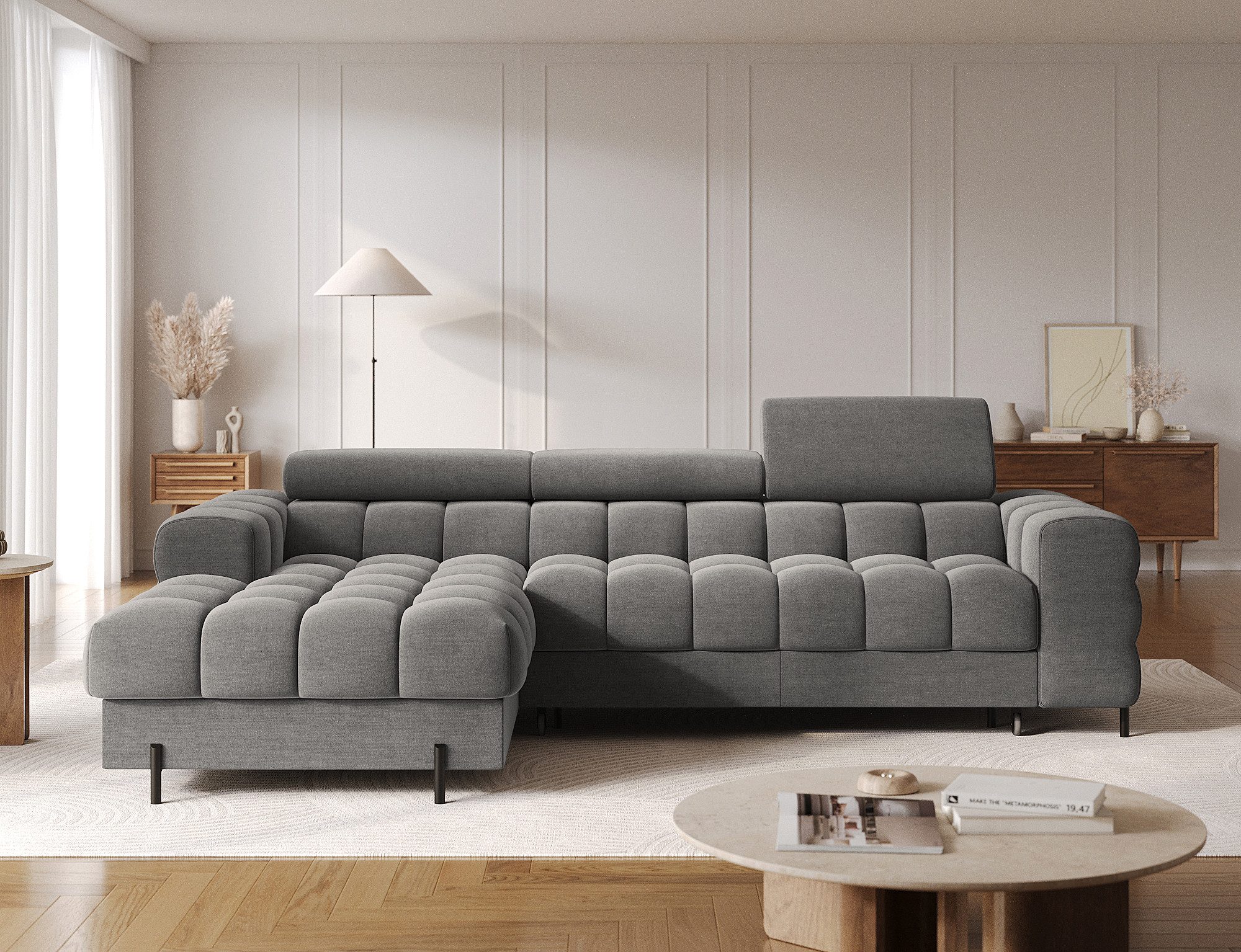 Das Ecksofa Fenro von MF-Design mit Bouclé Plüsch Bezug vereint modernes Design, Funktion und Gemütlichkeit. Die Schlaffunktion, der Bettkasten und die frei wählbare Ottomane machen dieses Sofa zur vielseitigen Lösung für stilvolle Wohnräume.