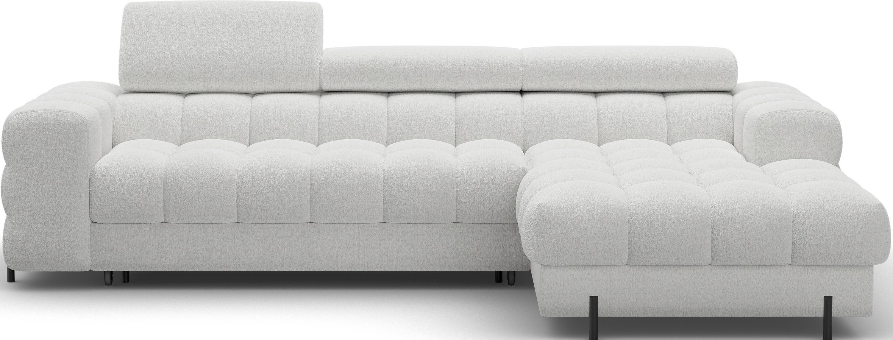 Das Ecksofa Fenro von MF-Design mit Bouclé Bezug steht für stilvolles Design, hohe Funktionalität und durchdachten Komfort. Es verfügt über eine Schlaffunktion, einen Bettkasten und eine frei wählbare Ottomane – ideal für moderne Wohnkonzepte.