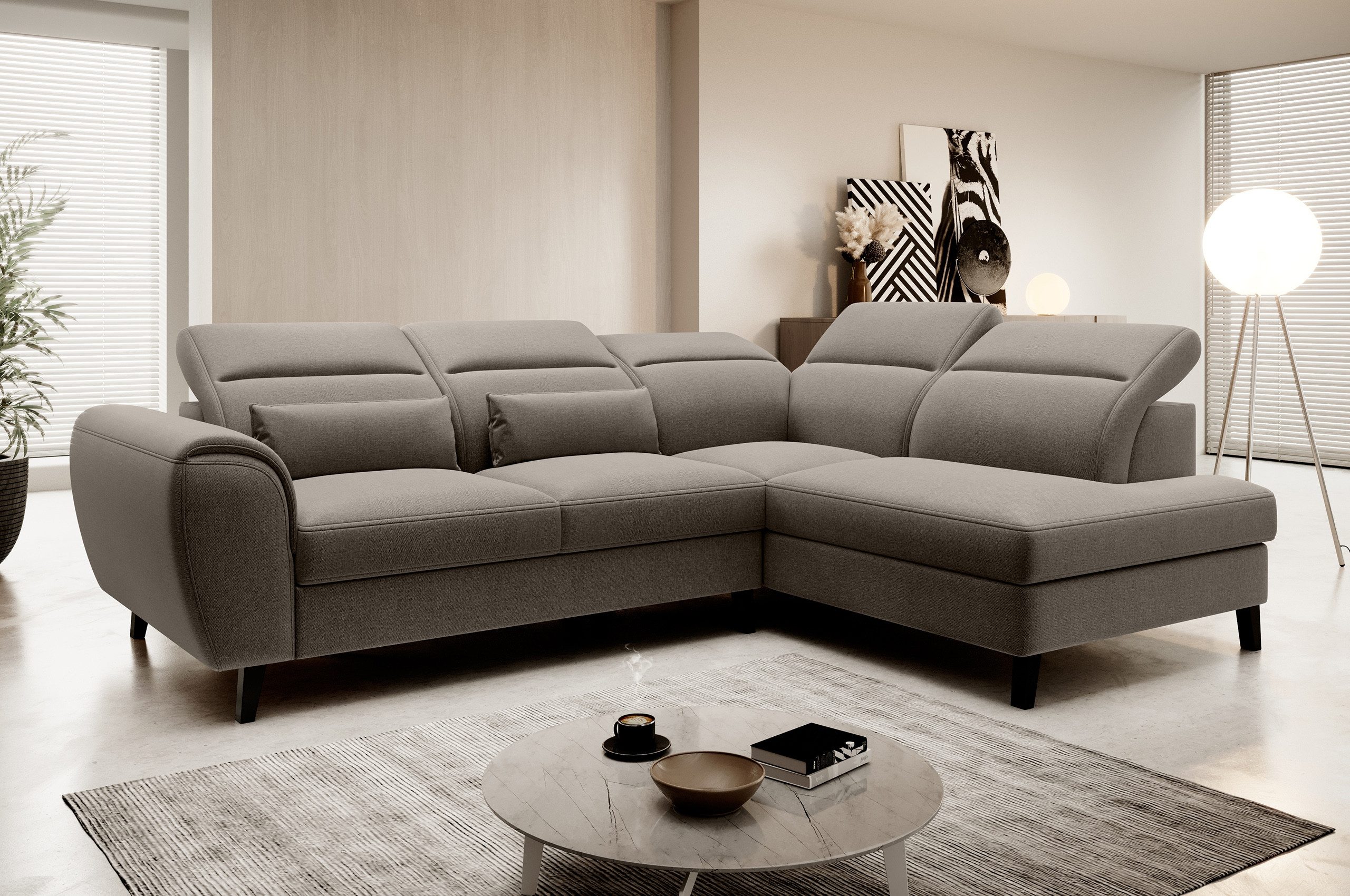 Das Ecksofa ist in einem Strukturstoff erhältlich, der eine luxuriöse Optik und angenehme Haptik bietet.