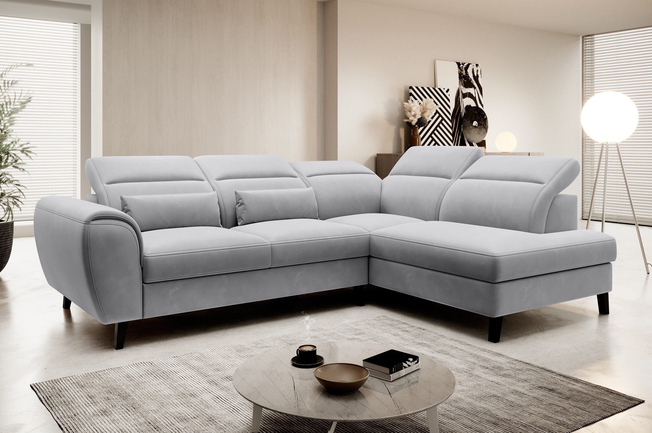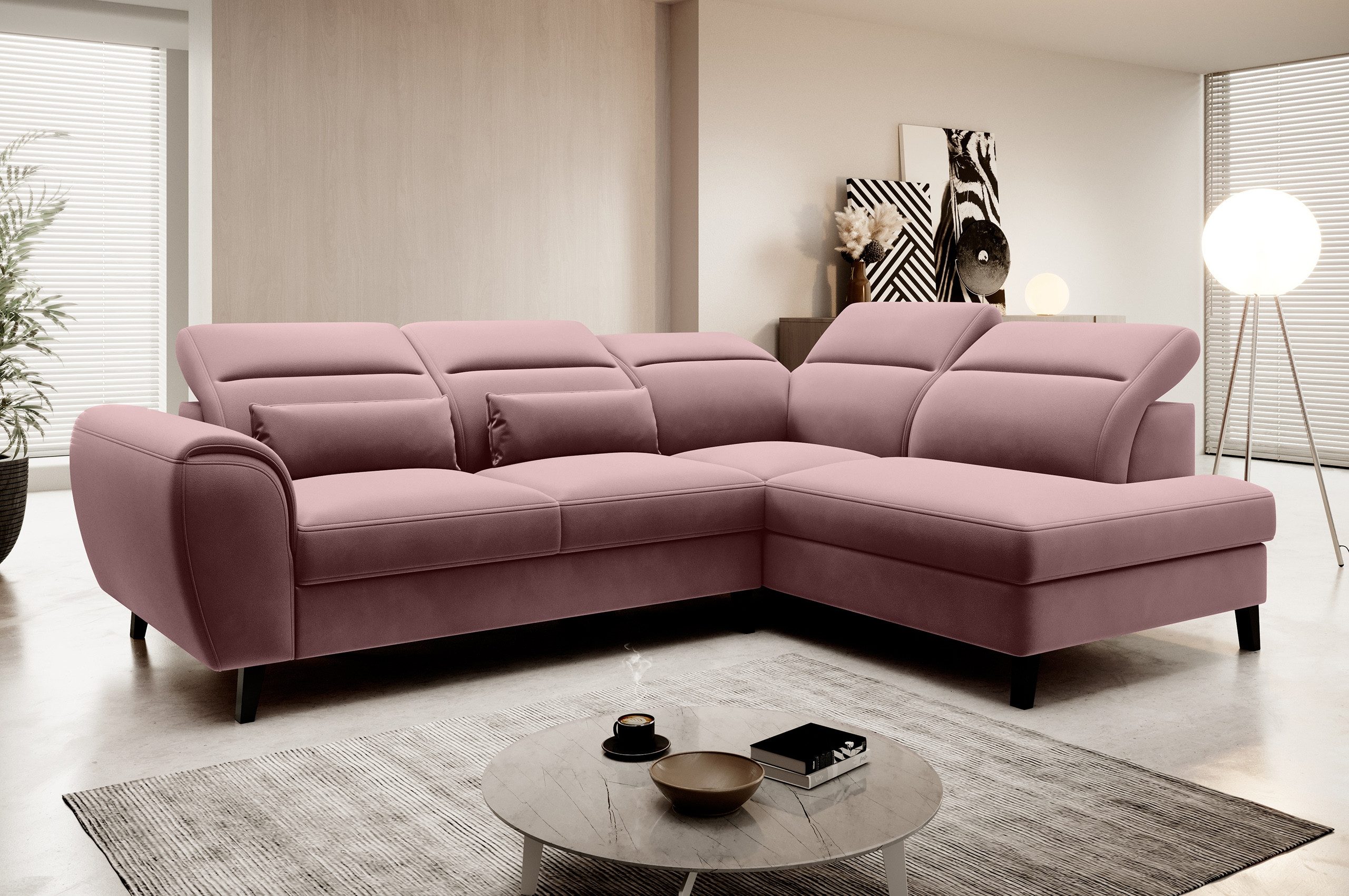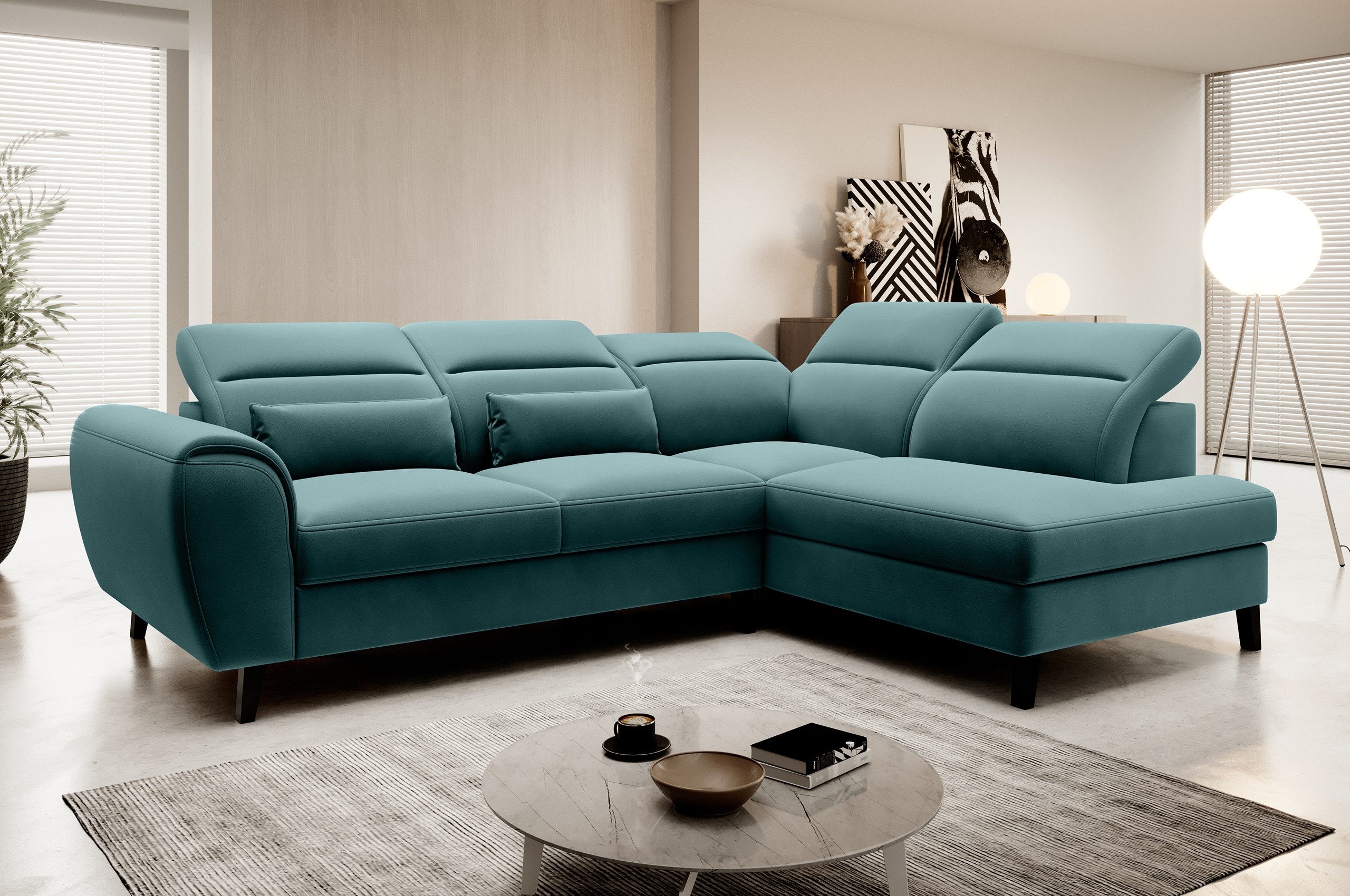 Das Ecksofa ist in weichem Velourstoff erhältlich, der eine luxuriöse Optik und angenehme Haptik bietet.