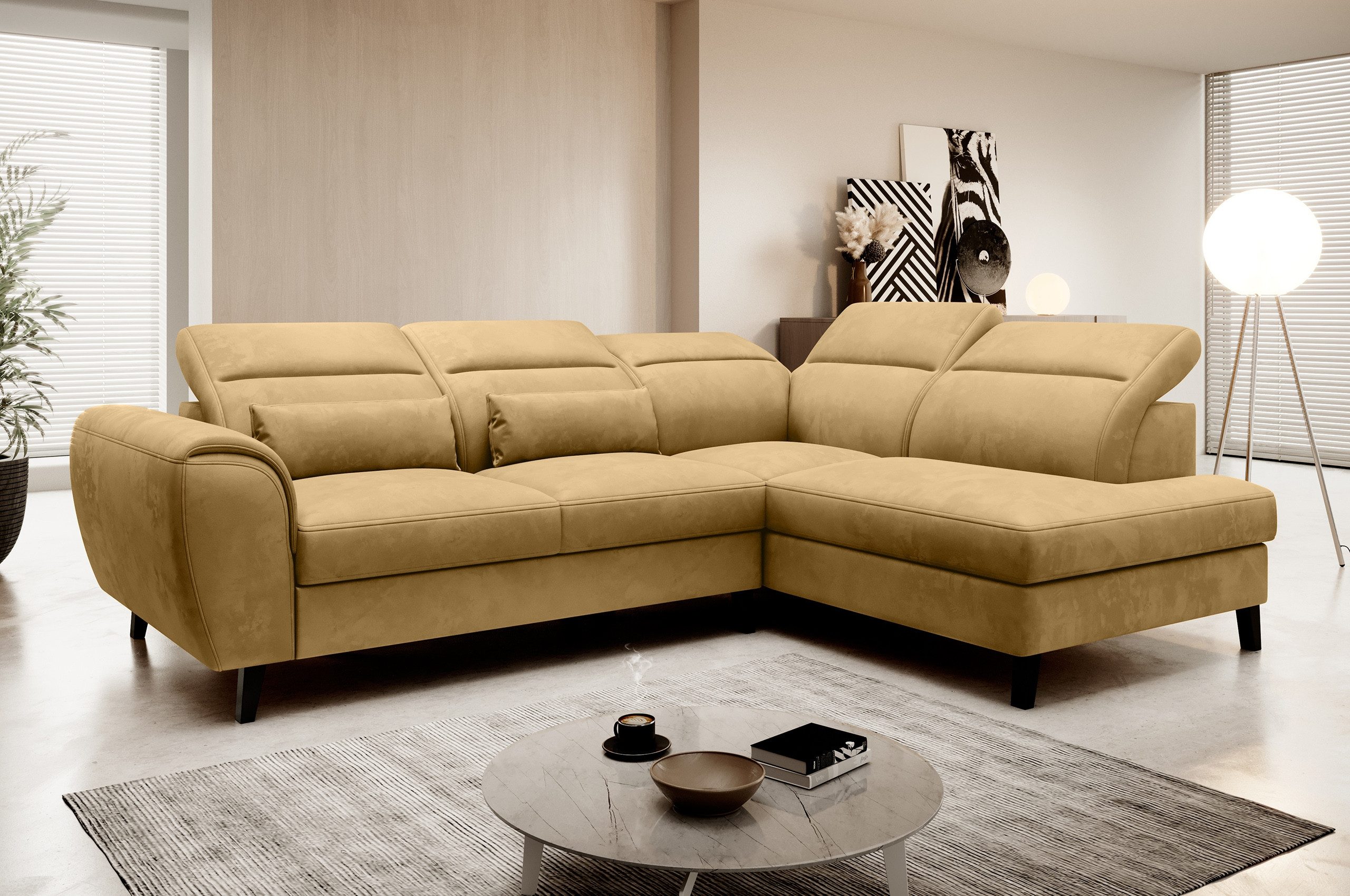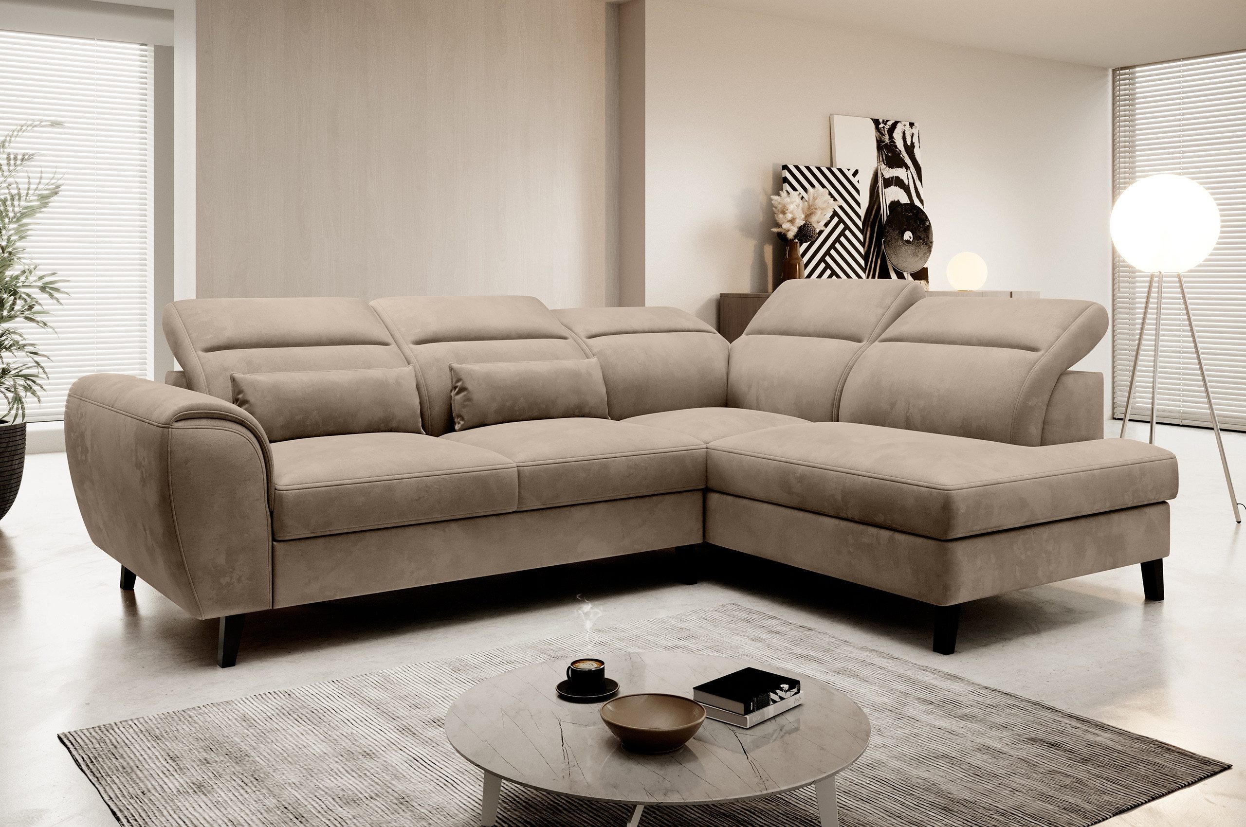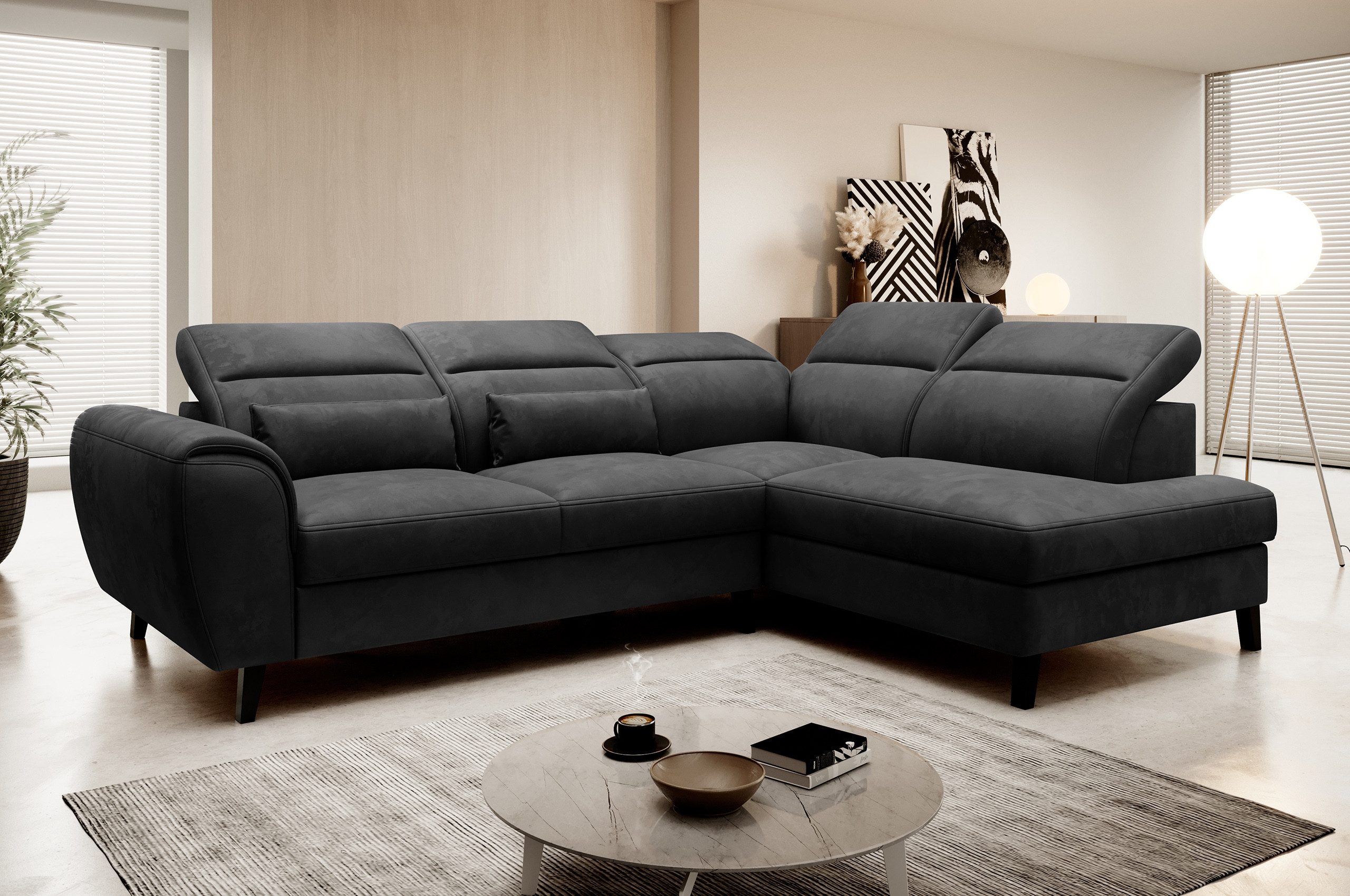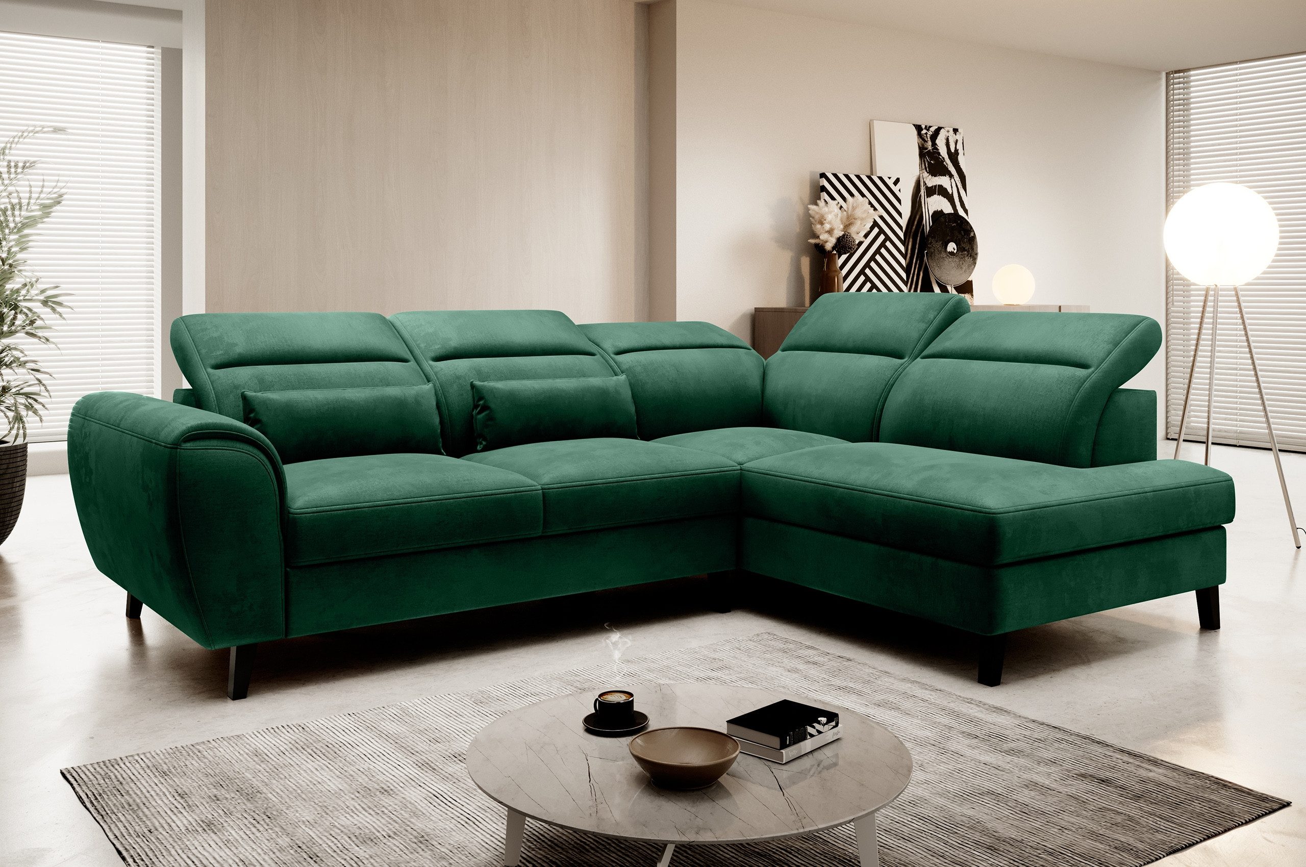 Das Ecksofa ist in weichem Velourstoff erhältlich, der eine luxuriöse Optik und angenehme Haptik bietet.