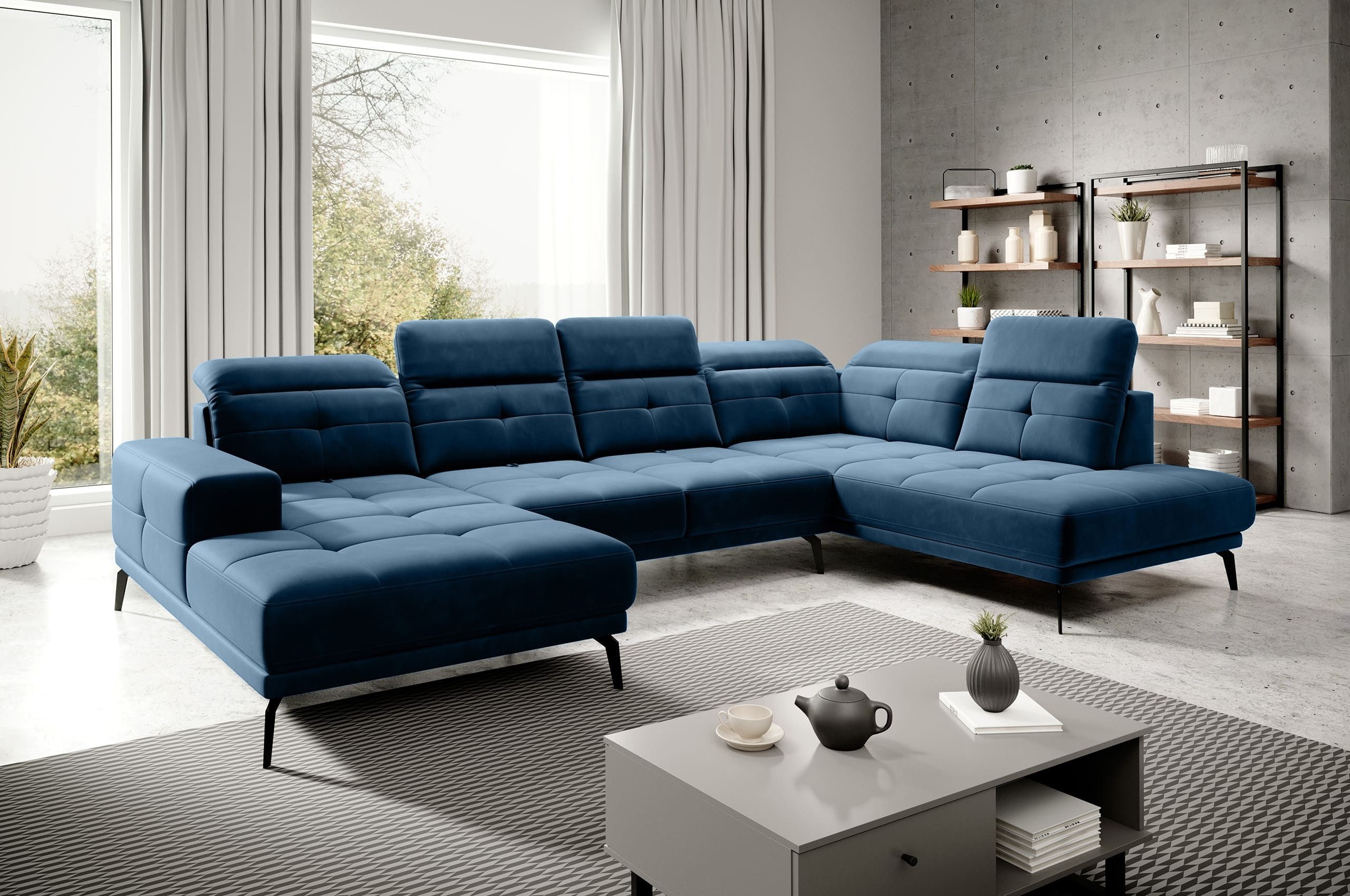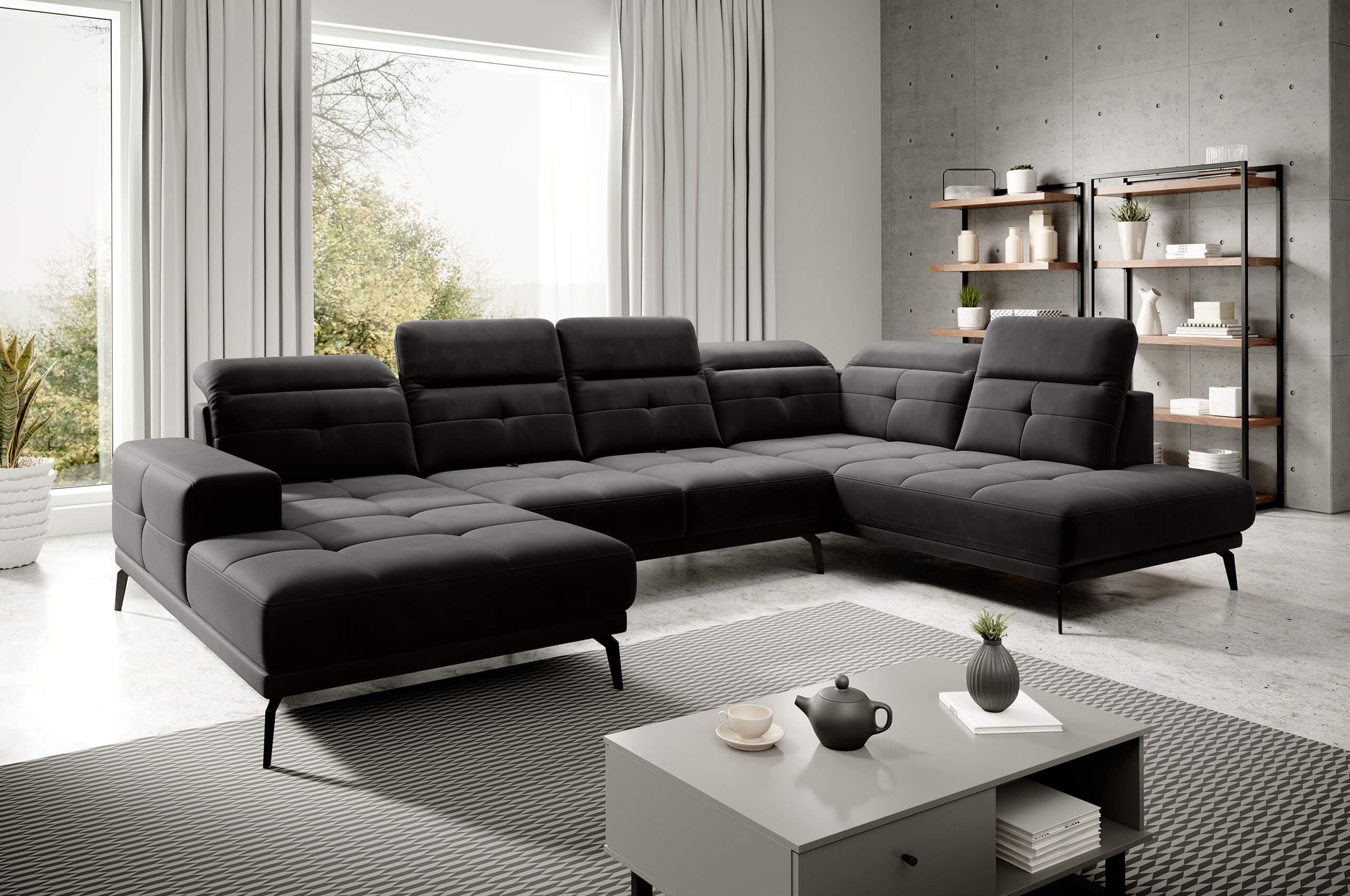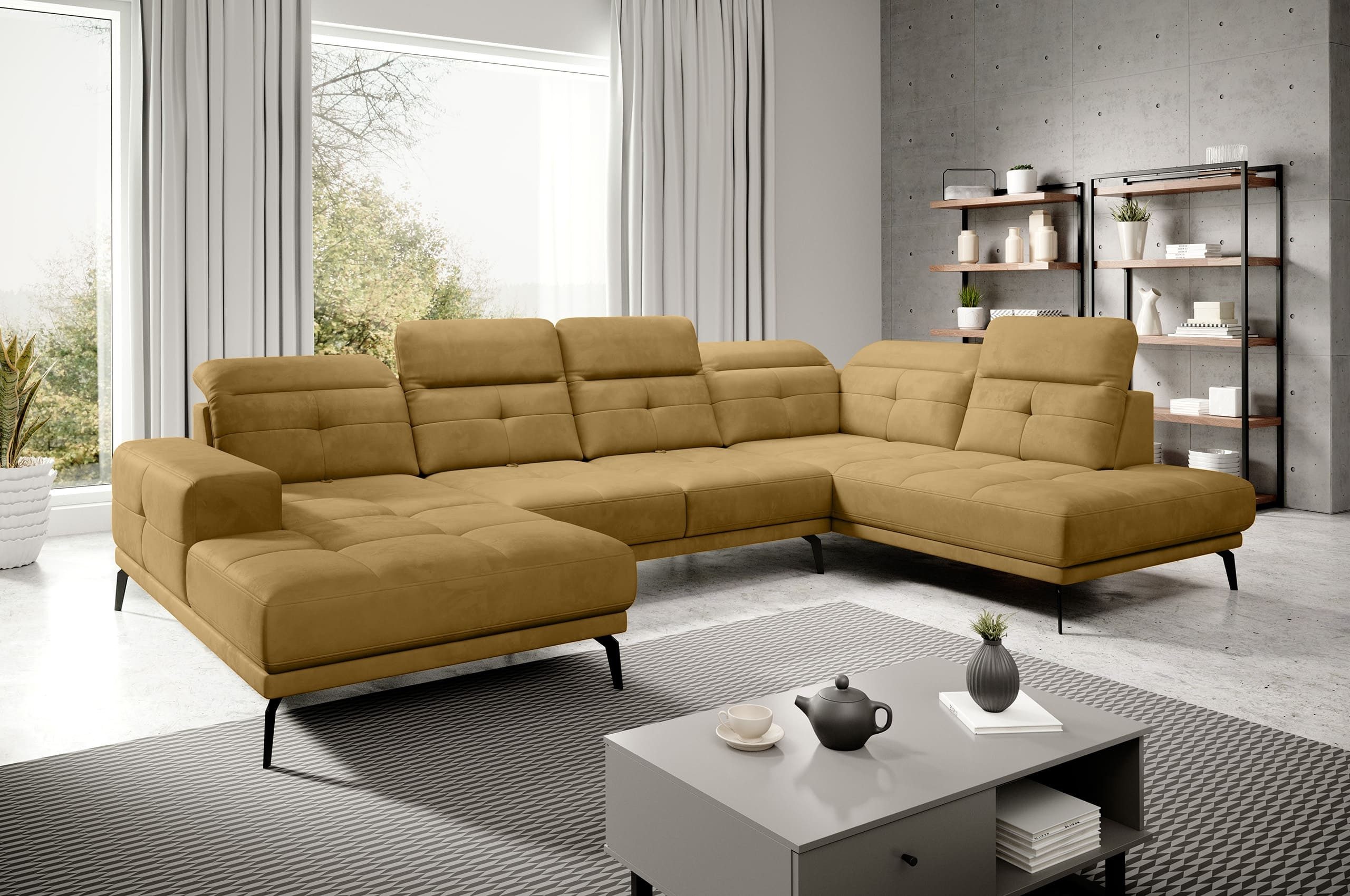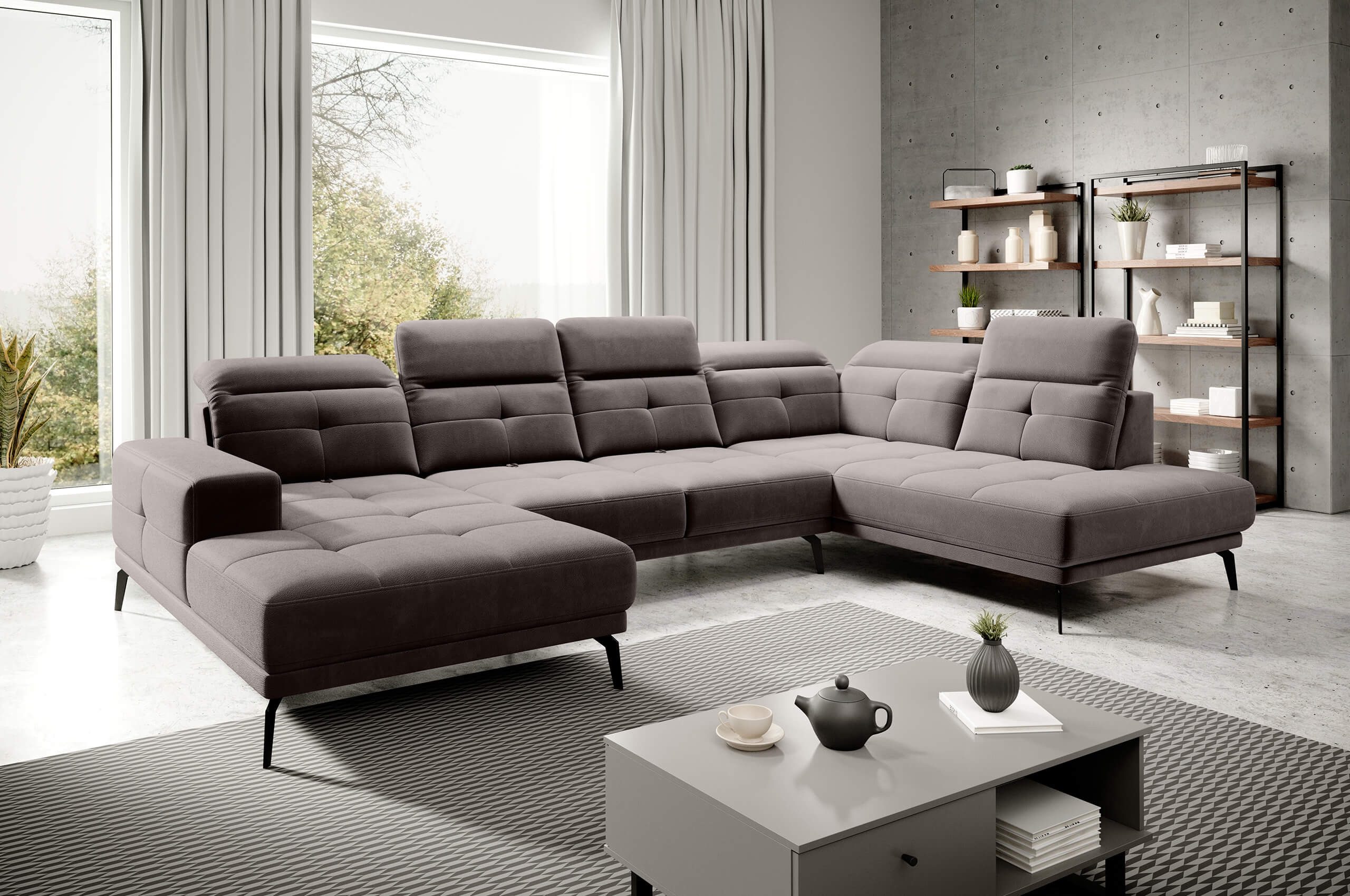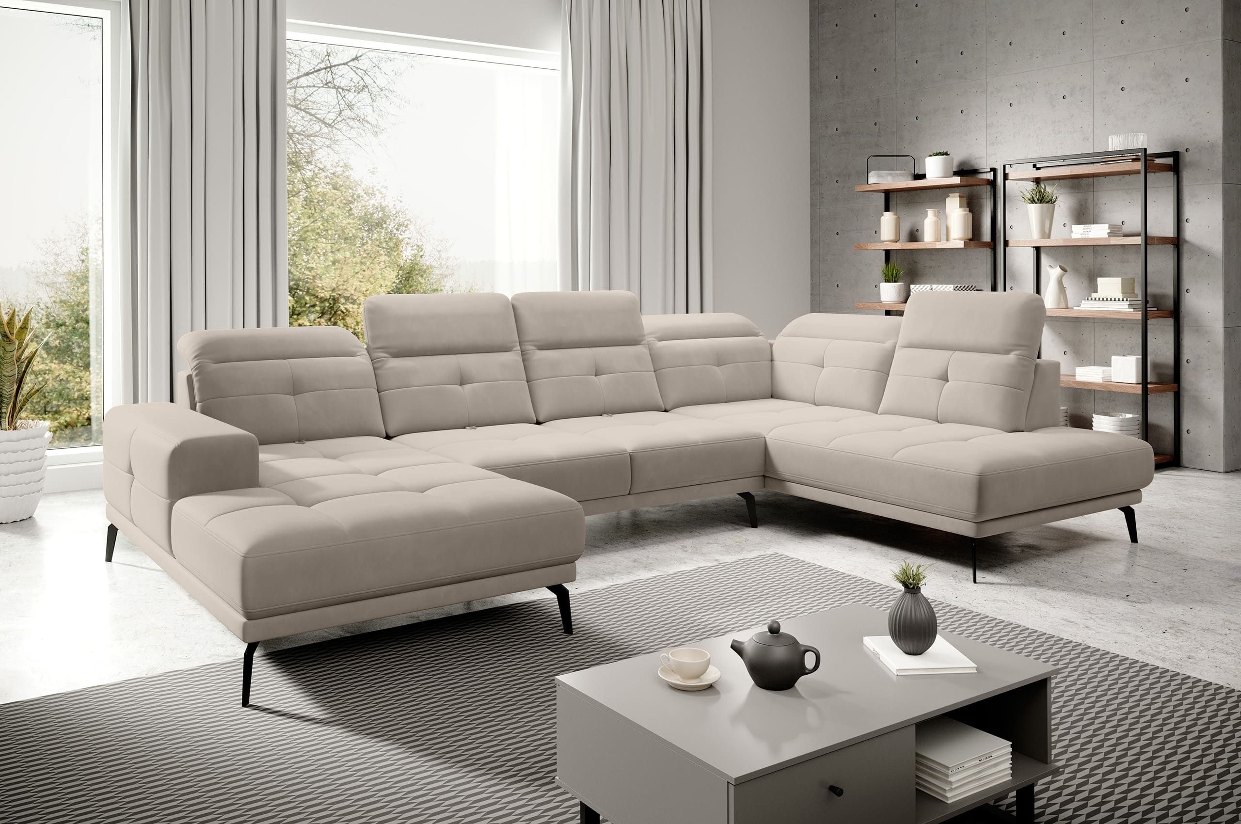 Das U-Sofa Brita im skandinavischen Design vereint minimalistischen Stil und Komfort auf höchstem Niveau. Mit Platz für sechs Personen und verstellbaren Kopfstützen bietet es eine flexible, bequeme Sitzgelegenheit für jedes Wohnzimmer. Die stilvolle Knopfheftung verleiht dem Sofa eine besondere Eleganz, die in modernen und klassischen Einrichtungsstilen gut zur Geltung kommt. Der robuste Holzrahmen und die langlebige Polsterung sorgen für Beständigkeit und machen das Sofa pflegeleicht. Dank der hohen Metallbeine in Schwarz wirkt das Sofa leicht und modern. Die widerstandsfähigen Materialien und die exzellente Verarbeitung machen das Sofa zur perfekten Wahl für eine langfristige Nutzung.