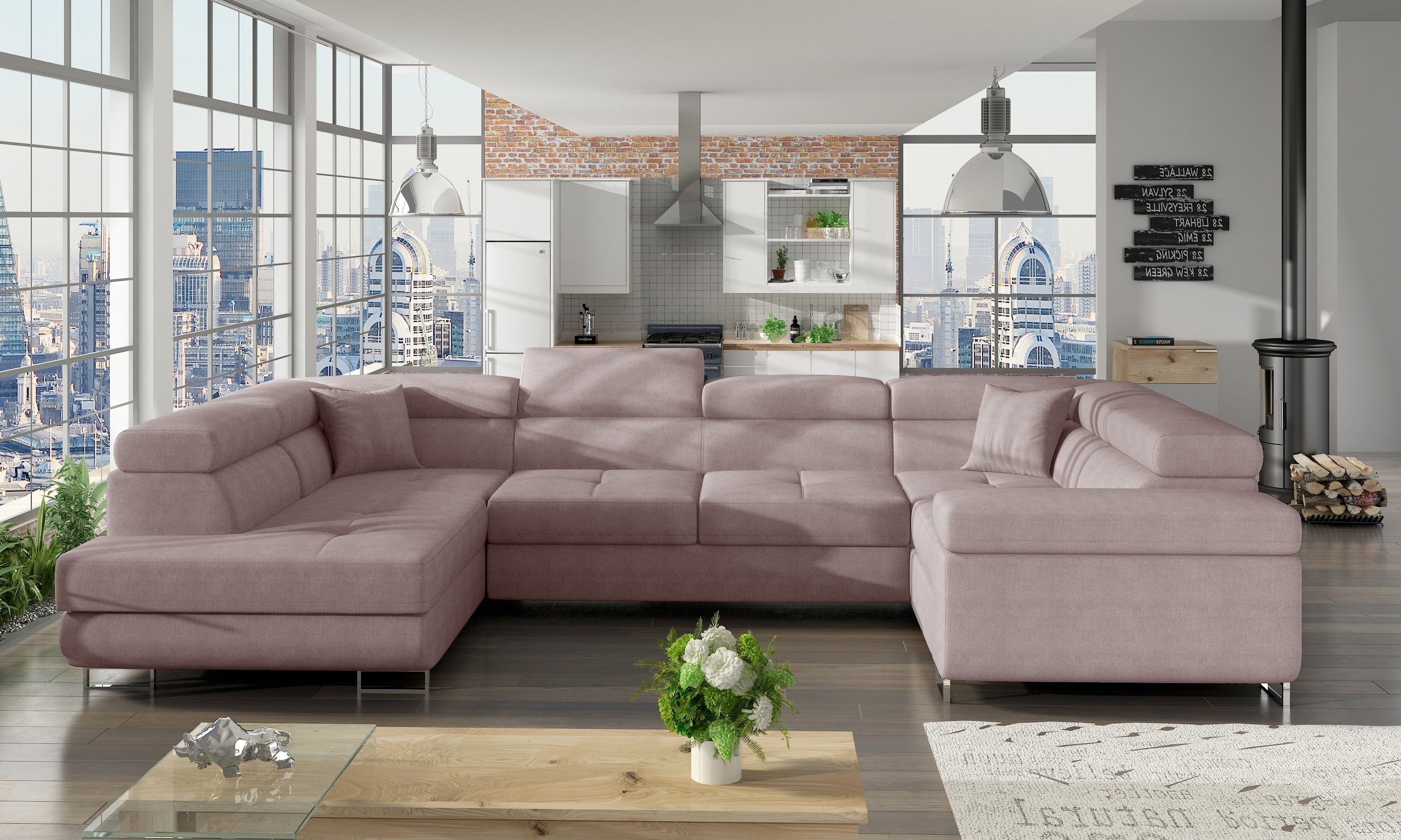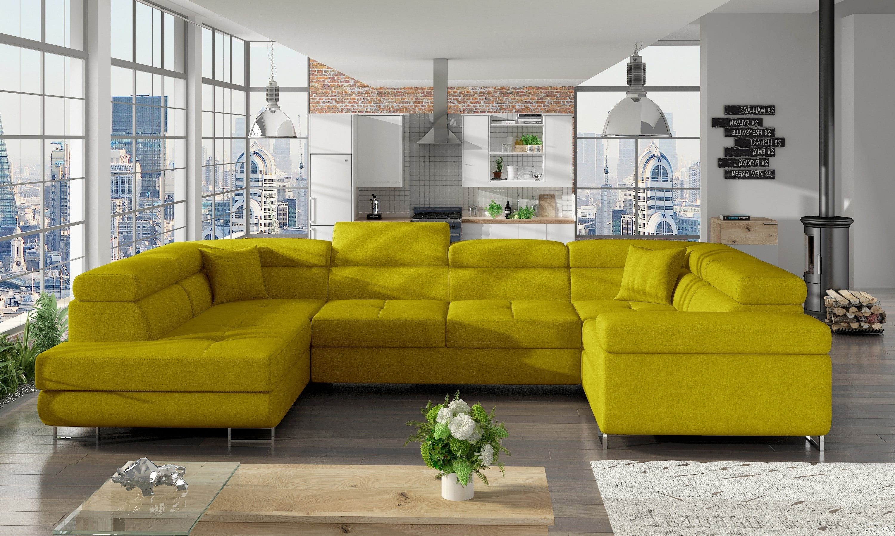Die Wohnlandschaft Lavin bietet eine perfekte Kombination aus Design und Funktionalität. Mit ihrer großzügigen U-Form und den Maßen 340 x 202 x 90 cm ist sie ein echter Hingucker in jedem Wohnzimmer. Die hochwertige Polsterung aus T30-Schaumstoff und Wellenfedern sorgt für ein angenehmes Sitzgefühl.