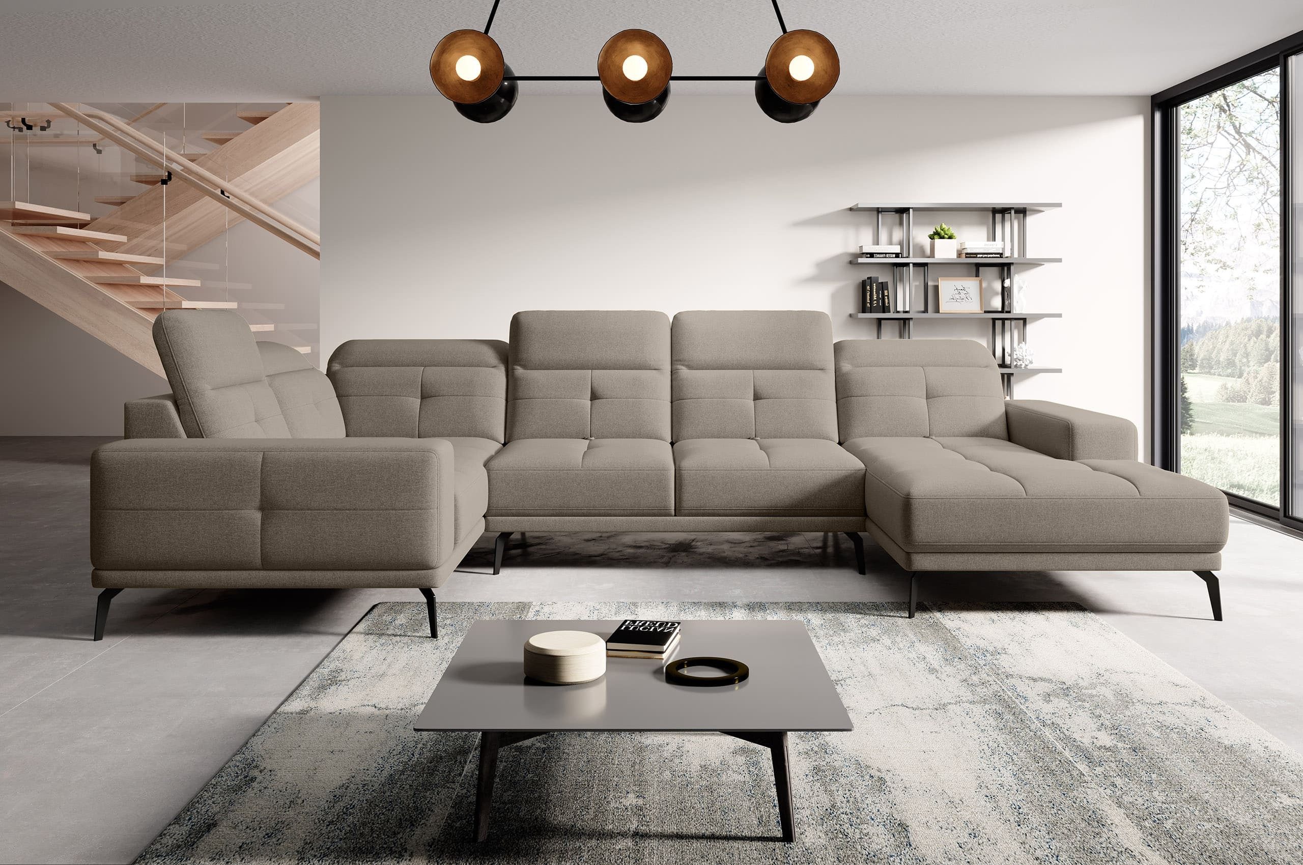 Die Wohnlandschaft Nevido in edlem Strukturstoff ist die perfekte Kombination aus modernem Design und funktionalem Komfort. Mit ihrer großzügigen U-Form und den Maßen 350 x 201 x 77 cm bietet sie ausreichend Platz für gemütliche Abende mit Familie oder Freunden. Der Bezug ist in einer Vielzahl von Farben erhältlich, sodass sich das Sofa mühelos in jedes Wohnambiente einfügt. Zusätzlich können Sie die Position der Ottomane flexibel wählen – rechts oder links – passend zu Ihrer Raumsituation.