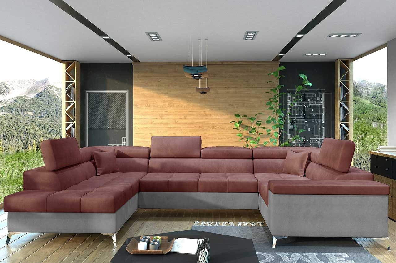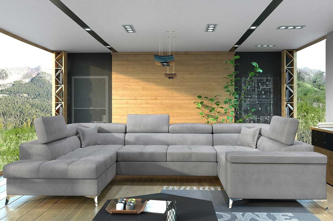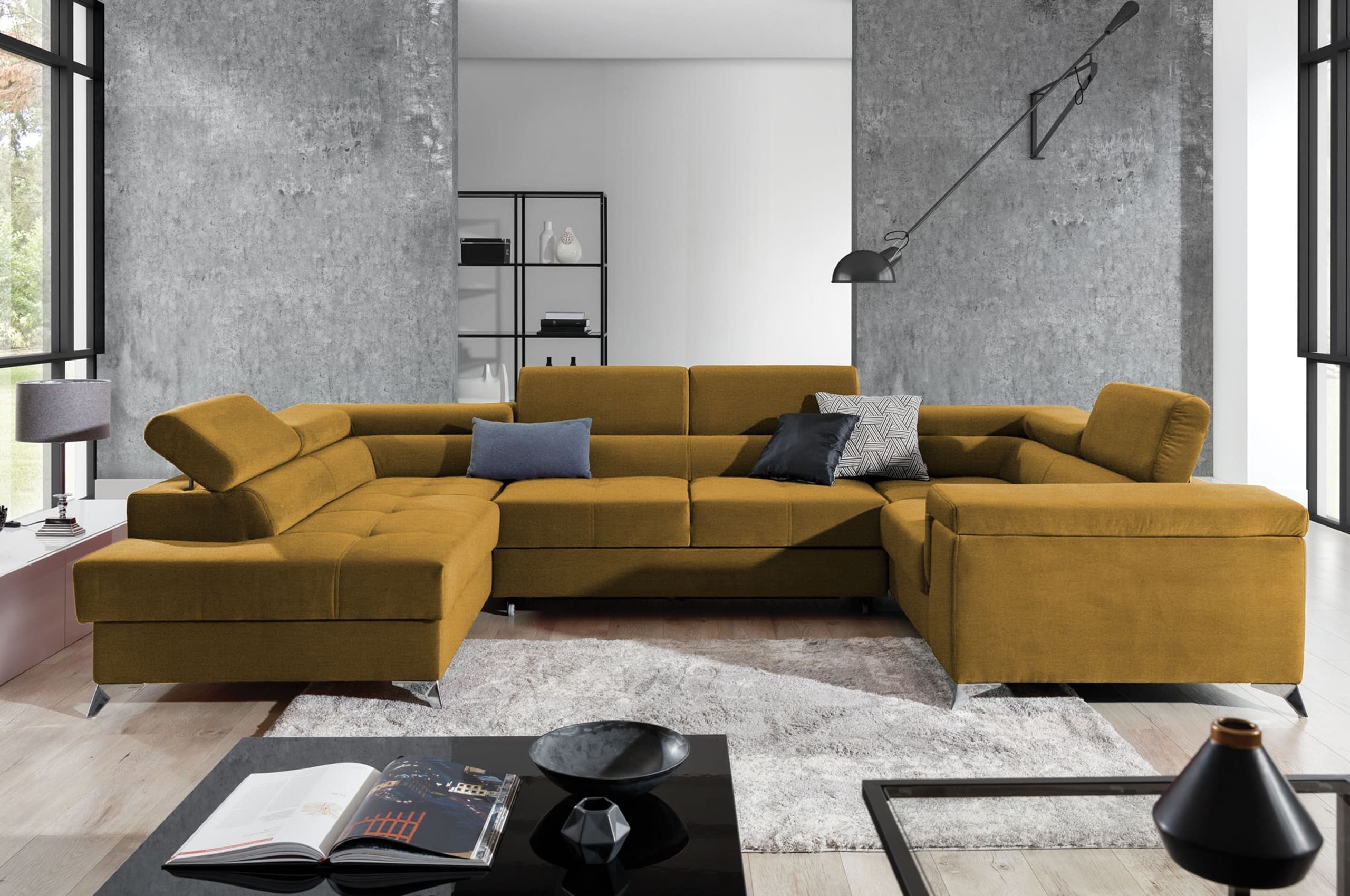 Das Ecksofa Tiya in moderner U-Form besticht durch seine Vielseitigkeit und großzügige Maße von 342 x 208 x 88 cm. Es bietet Platz für bis zu 6 Personen und verfügt über verstellbare Kopfstützen für individuellen Komfort.