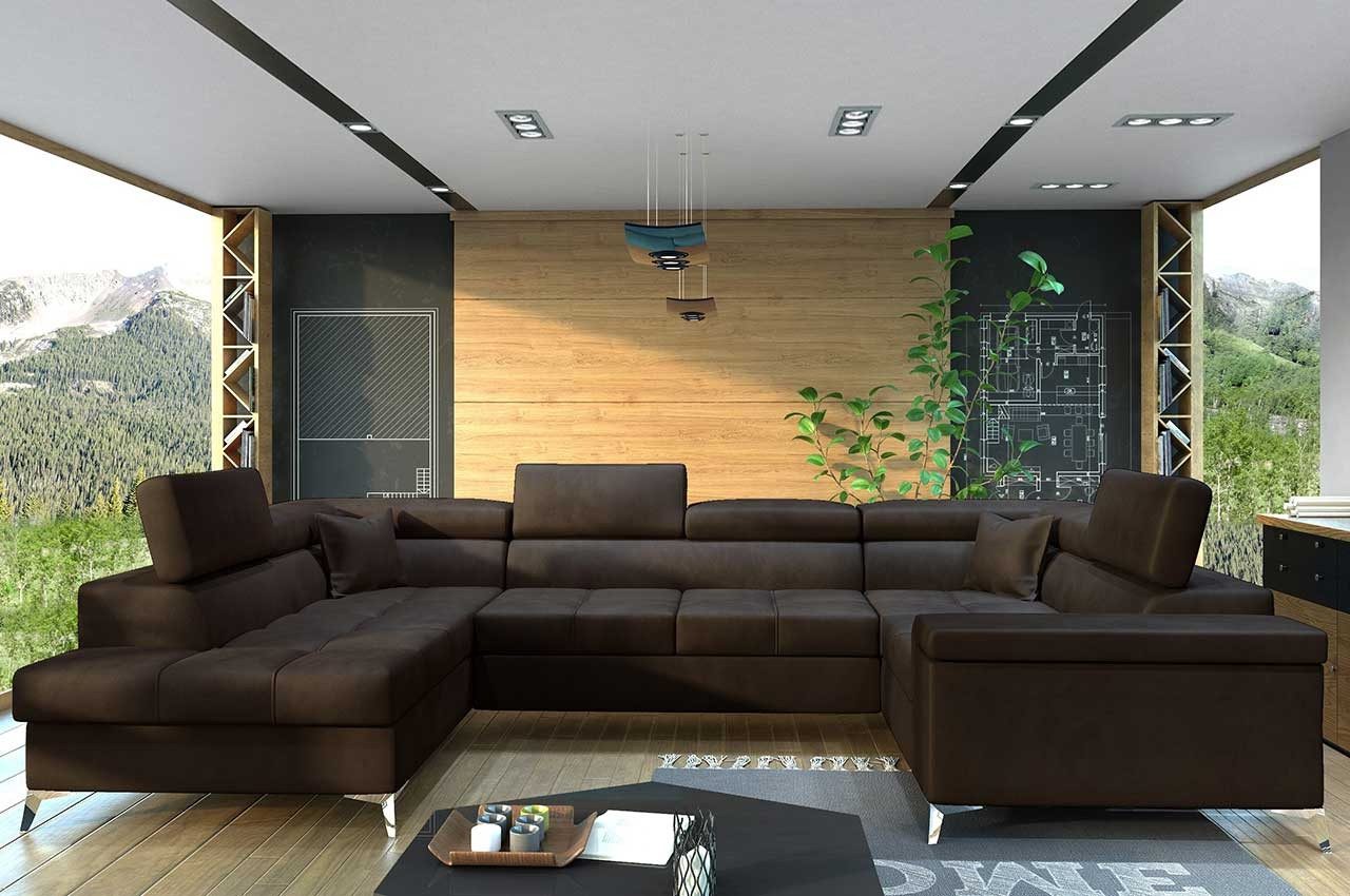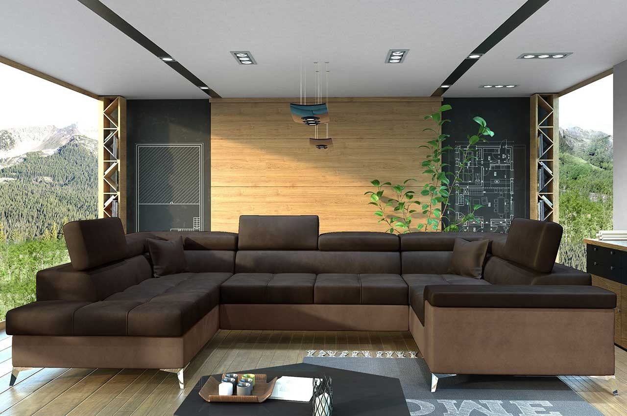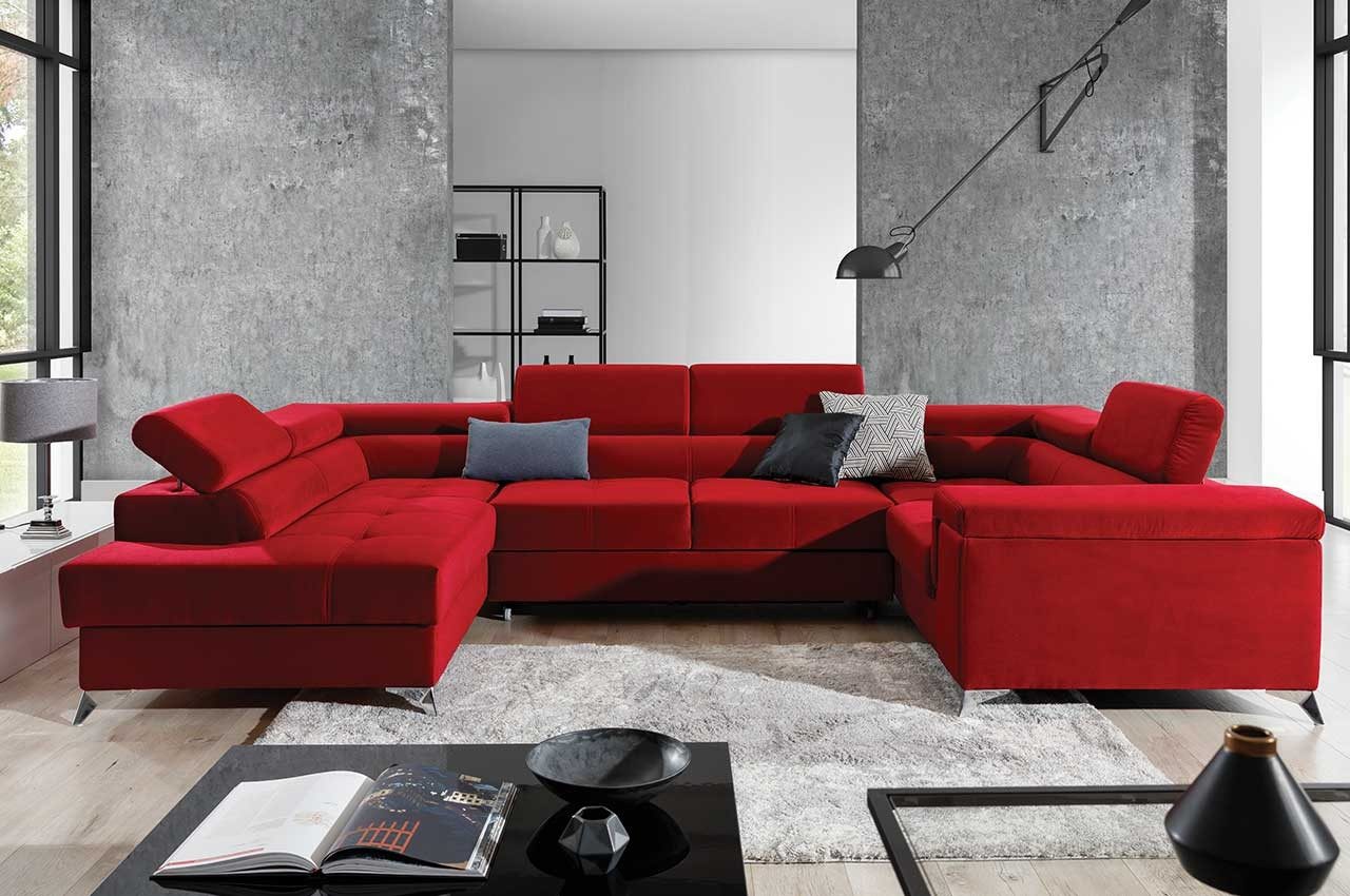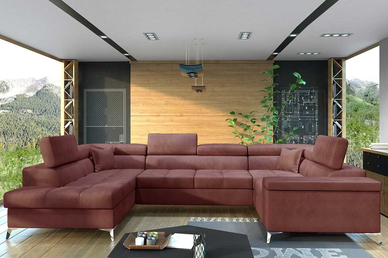 Das Ecksofa Tiya in moderner U-Form besticht durch seine Vielseitigkeit und großzügige Maße von 342 x 208 x 88 cm. Es bietet Platz für bis zu 6 Personen und verfügt über verstellbare Kopfstützen für individuellen Komfort.