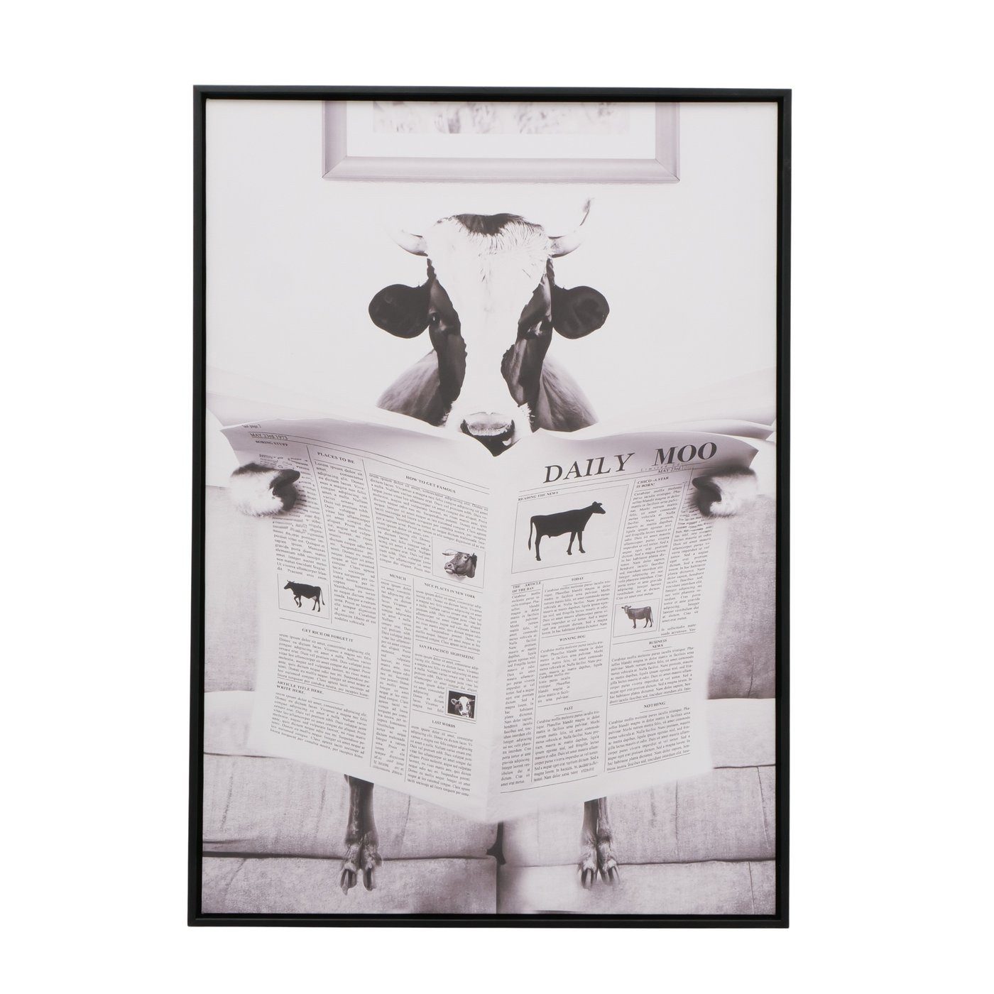 Mit einem Augenzwinkern bringt das Leinwandbild Leinwandbild Kuh Daily Moo 70x50 cm Kunstdruck mit Rahmen ländlichen Charme und humorvolle Eleganz in Ihre vier Wände. Die schwarz-weiße Kuh, vertieft in ihre ganz eigene "Daily Moo"-Zeitung, sorgt garantiert für Gesprächsstoff. In dezenten Grautönen gehalten und mit einem schlanken Rahmen versehen, passt dieses Wandbild perfekt in moderne wie auch rustikale Wohnkonzepte. Die hochwertige Druckqualität auf Leinwand und die detailreiche Darstellung machen das Bild zu einem echten Hingucker – ob in Küche, Flur oder Wohnzimmer. Eigenschaften: Material: Polystyrol Kunststoff, bedruckte Leinwand Verwendung: Für den Innenbereich geeignet Kategorie: Dekoration / Wandbild / Kunstdruck Design: Mehrfarbig auf grauem Hintergrund, Motiv: Kuh Rahmen: Inklusive, mit Hängevorrichtung für einfache Montage Maße: Длина: 4 cm Breite: 50 cm Höhe: 70 cm