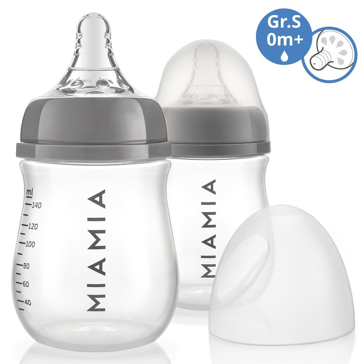Lieferumfang | 2 MiaMia PP-Flaschen 140 ml 2 Silikon-Trinksauger Gr. S 2 Schraubringe 2 Verschlusskappen |