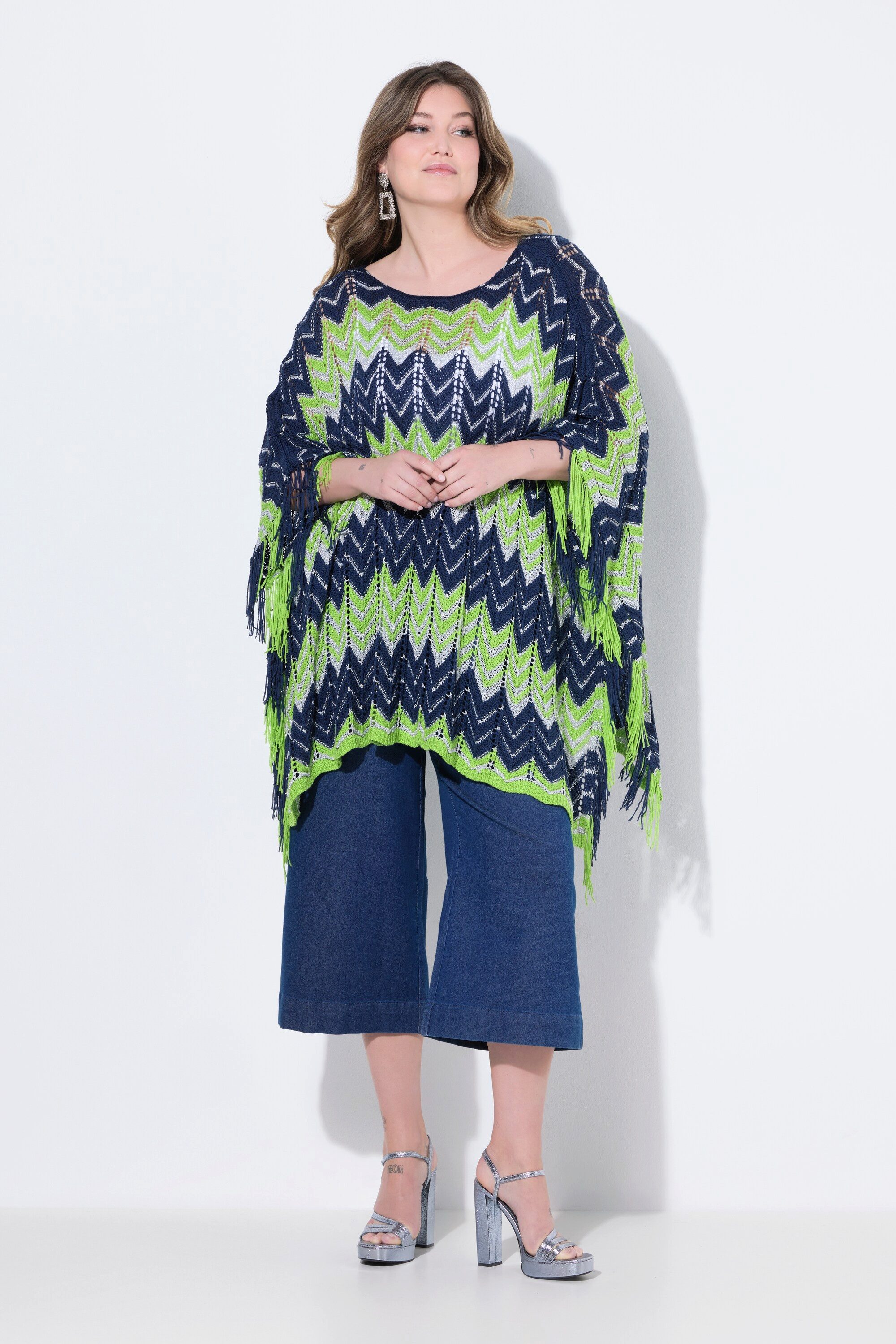 Poncho, oversized, aus zweifarbigem Zackenstrick mit Glitzer-Effekt. U-Boot-Ausschnitt, breit überschnittene Schultern, Seitennähte mit Fransen.
